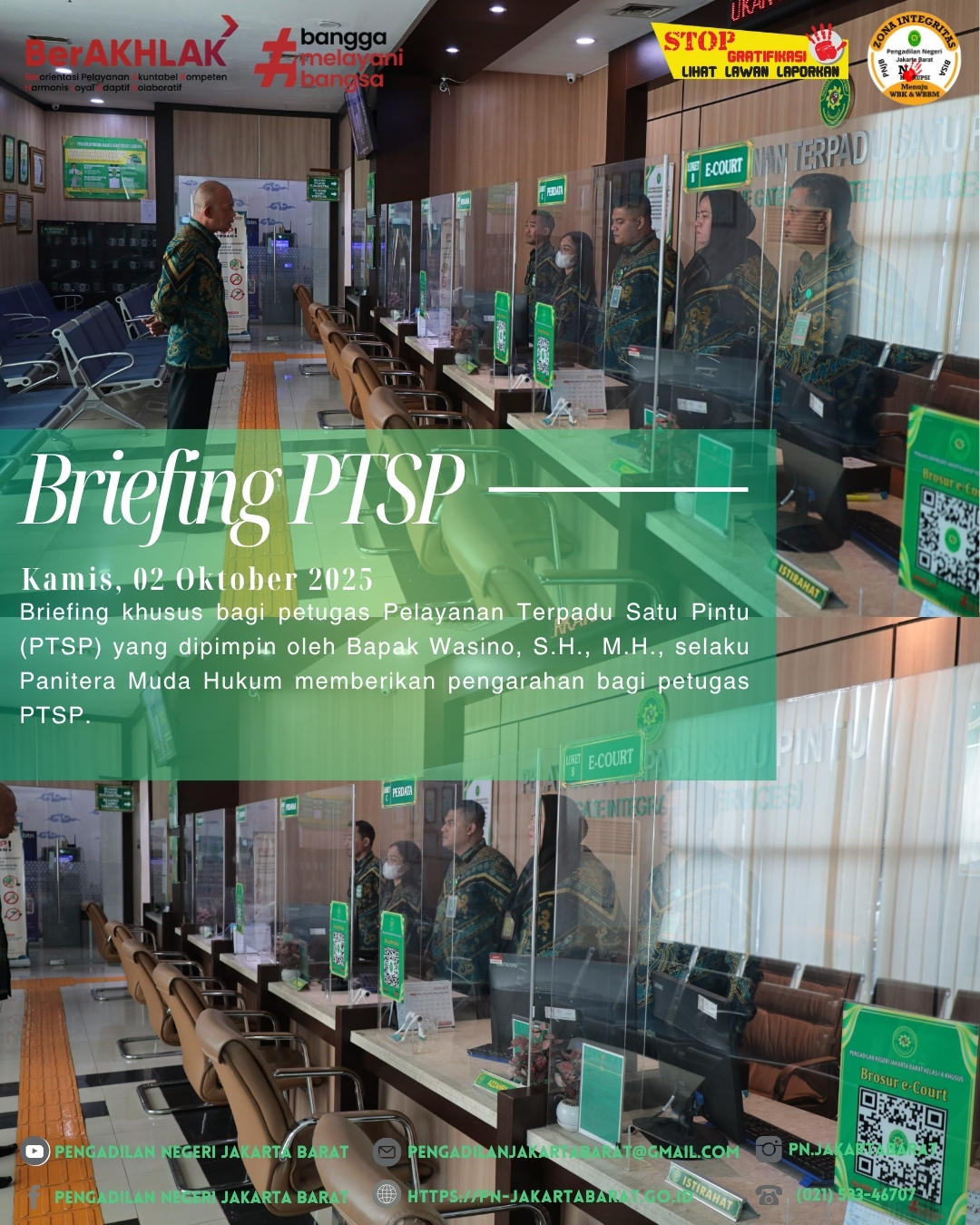Briefing tersebut bertujuan untuk meningkatkan kualitas pelayanan kepada masyarakat yang membutuhkan layanan di Pengadilan Negeri Jakarta Barat Kelas IA Khusus. Dalam kesempatan ini, para petugas PTSP diberikan arahan dan penekanan terhadap pentingnya pelayanan yang efisien, transparan, dan akuntabel.