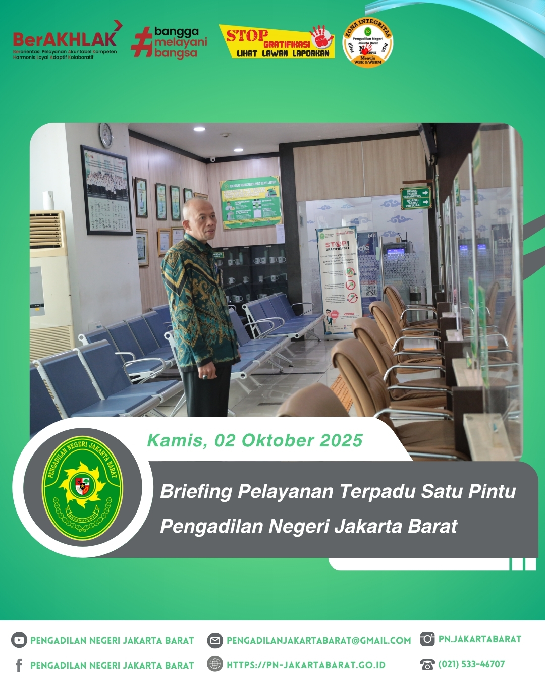 Bertempat di lobi PTSP Pengadilan Negeri Jakarta Barat Kelas IA Khusus, telah diadakan briefing khusus bagi petugas Pelayanan Terpadu Satu Pintu (PTSP) yang dipimpin oleh Panitera Muda Hukum, Bapak Wasino, S.H., M.H.