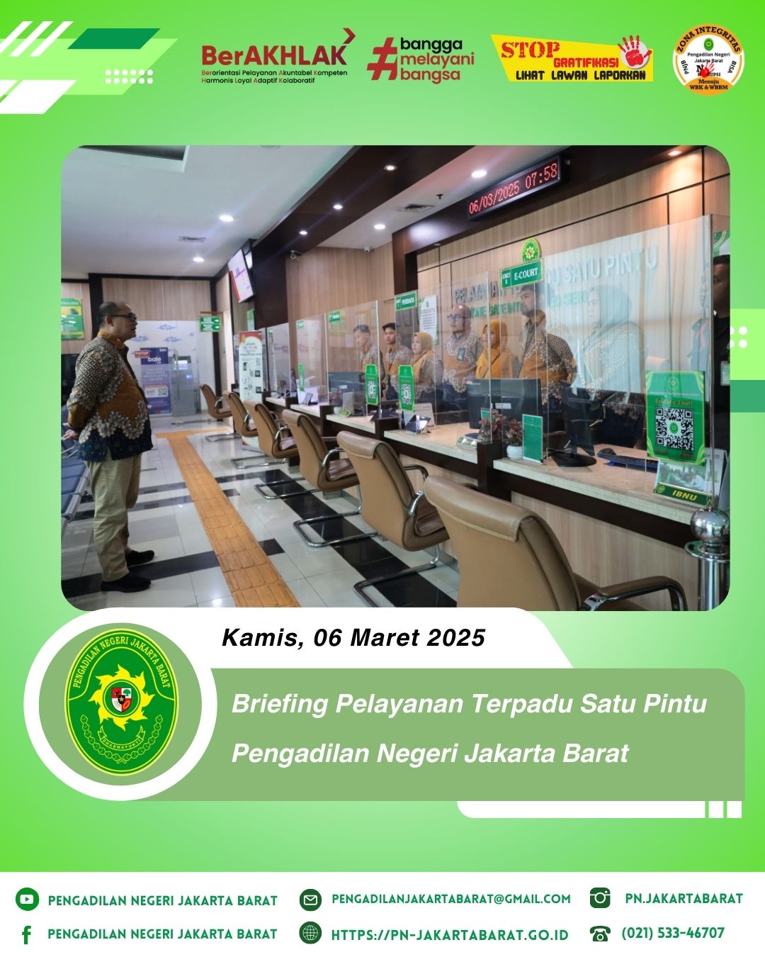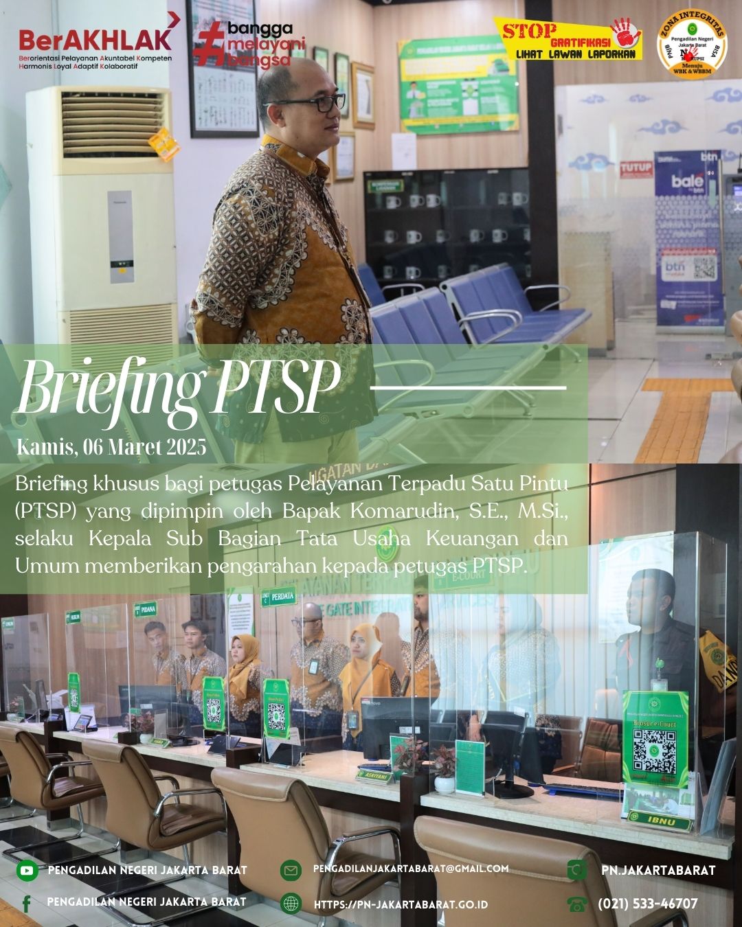 *PNJB, 06 Maret 2025* - Bertempat di lobi PTSP Pengadilan Negeri Jakarta Barat, telah diadakan briefing khusus bagi petugas Pelayanan Terpadu Satu Pintu (PTSP) yang dipimpin oleh Bapak Komarudin, S.E., M.Si., selaku Kepala Sub Bagian Tata Usaha Keuangan dan Umum.