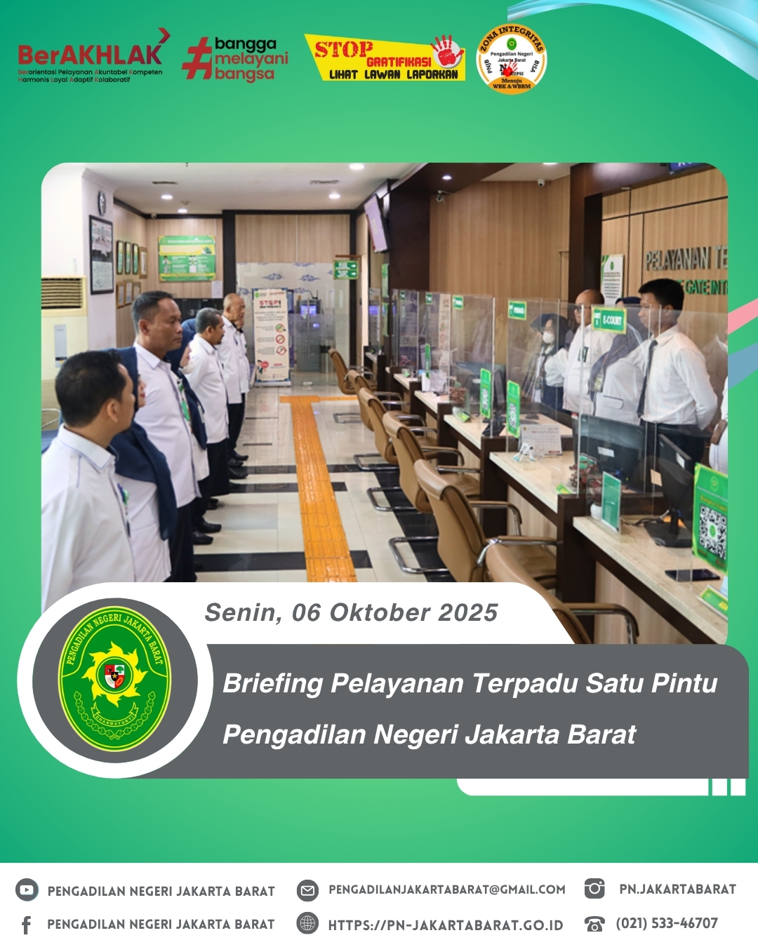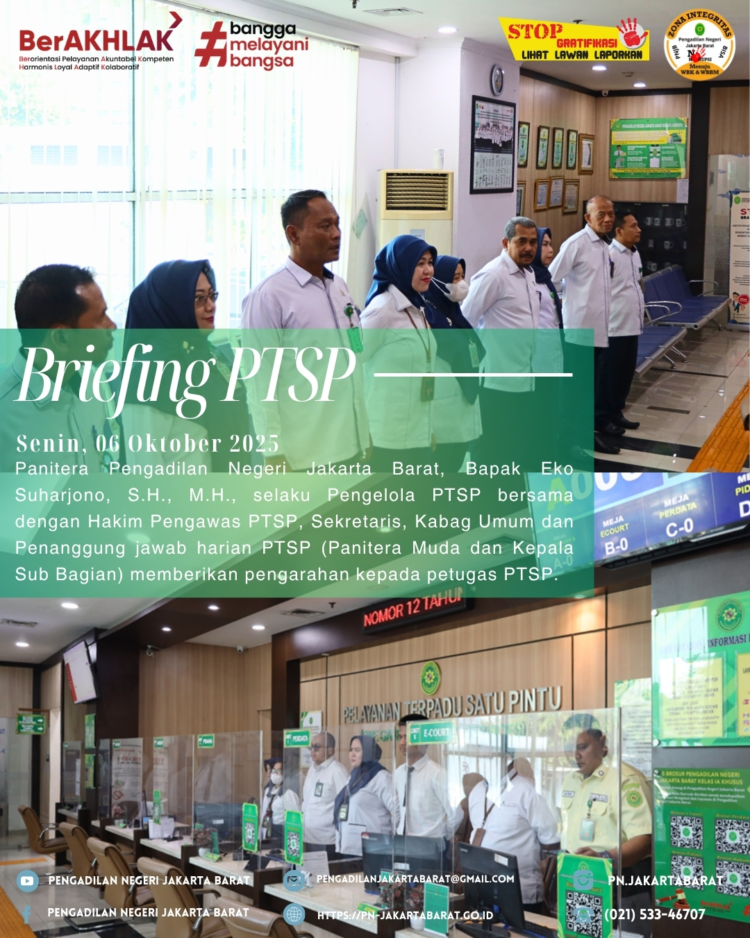 Briefing Pelayanan Terpadu Satu Pintu (PTSP) yang berlangsung di lobi PTSP Pengadilan Negeri Jakarta Barat dipimpin oleh Panitera Pengadilan Negeri Jakarta Barat, Bapak Eko Suharjono, S.H., M.H., selaku Pengelola PTSP bersama dengan Hakim Pengawas PTSP, Kabag Umum dan Penanggung jawab harian PTSP (Panitera Muda dan Kepala Sub Bagian) memberikan pengarahan kepada petugas PTSP.
