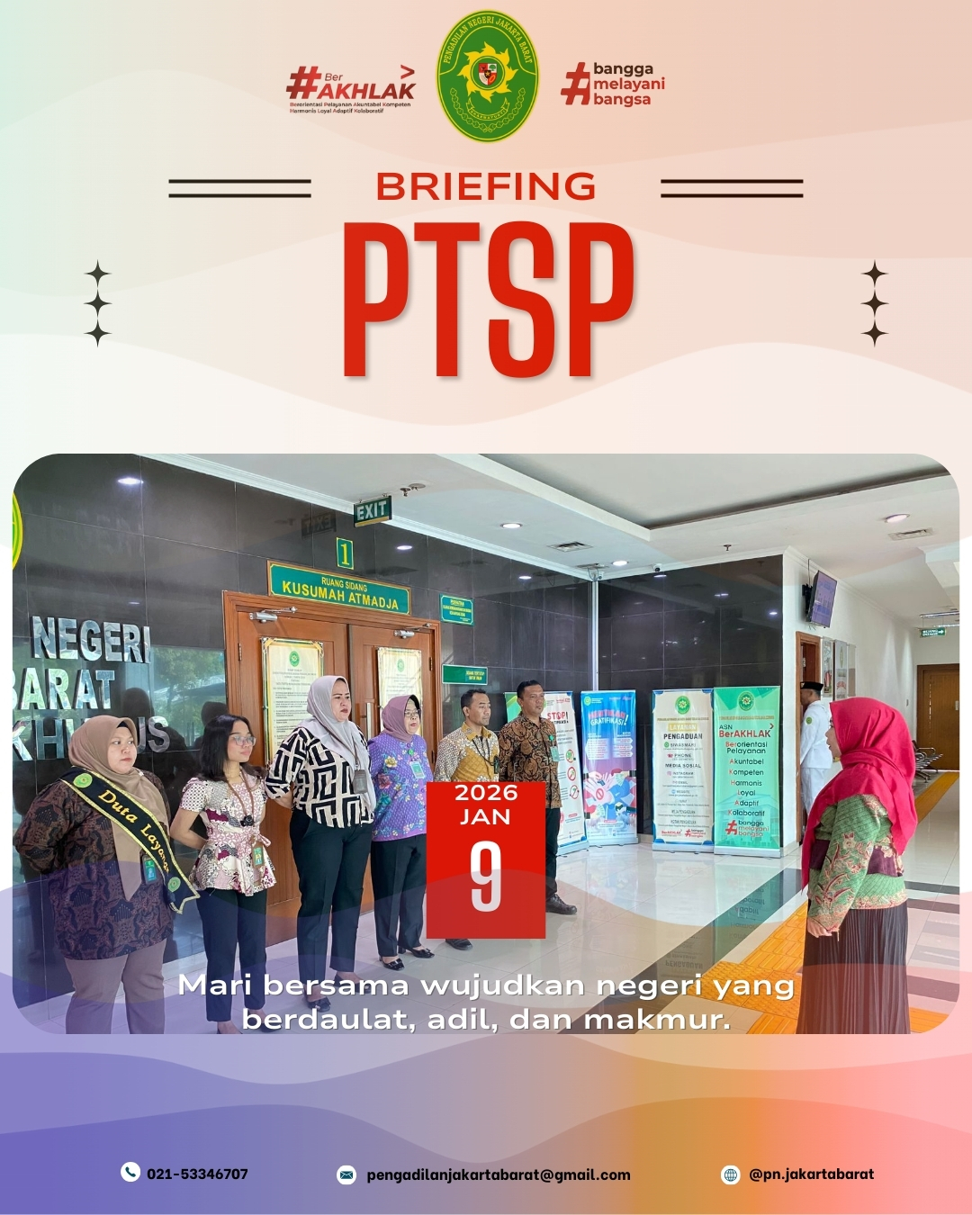 Briefing Pelayanan Terpadu Satu Pintu (PTSP) yang berlangsung di lobi PTSP Pengadilan Negeri Jakarta Barat dipimpin oleh Panitera Muda Pidana Pengadilan Negeri Jakarta Barat, Ibu Endang Purwaningsih, S.H., M.H., selaku Pengelola PTSP bersama dengan Wakil Ketua, Kabag Umum dan Penanggung jawab harian PTSP (Kepala Sub Bagian) memberikan pengarahan kepada petugas PTSP.