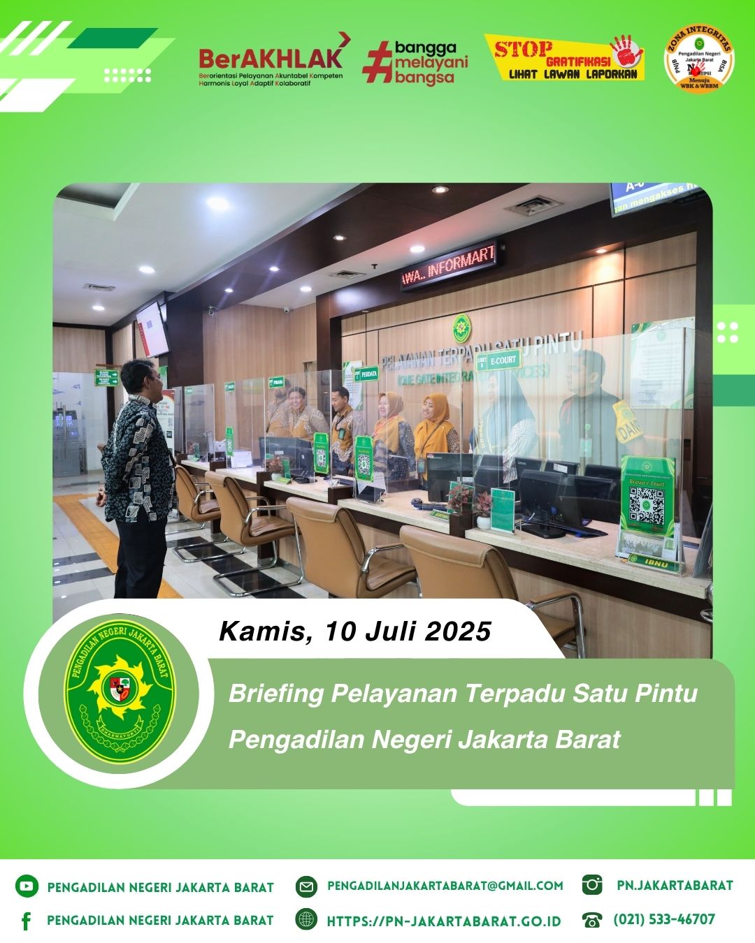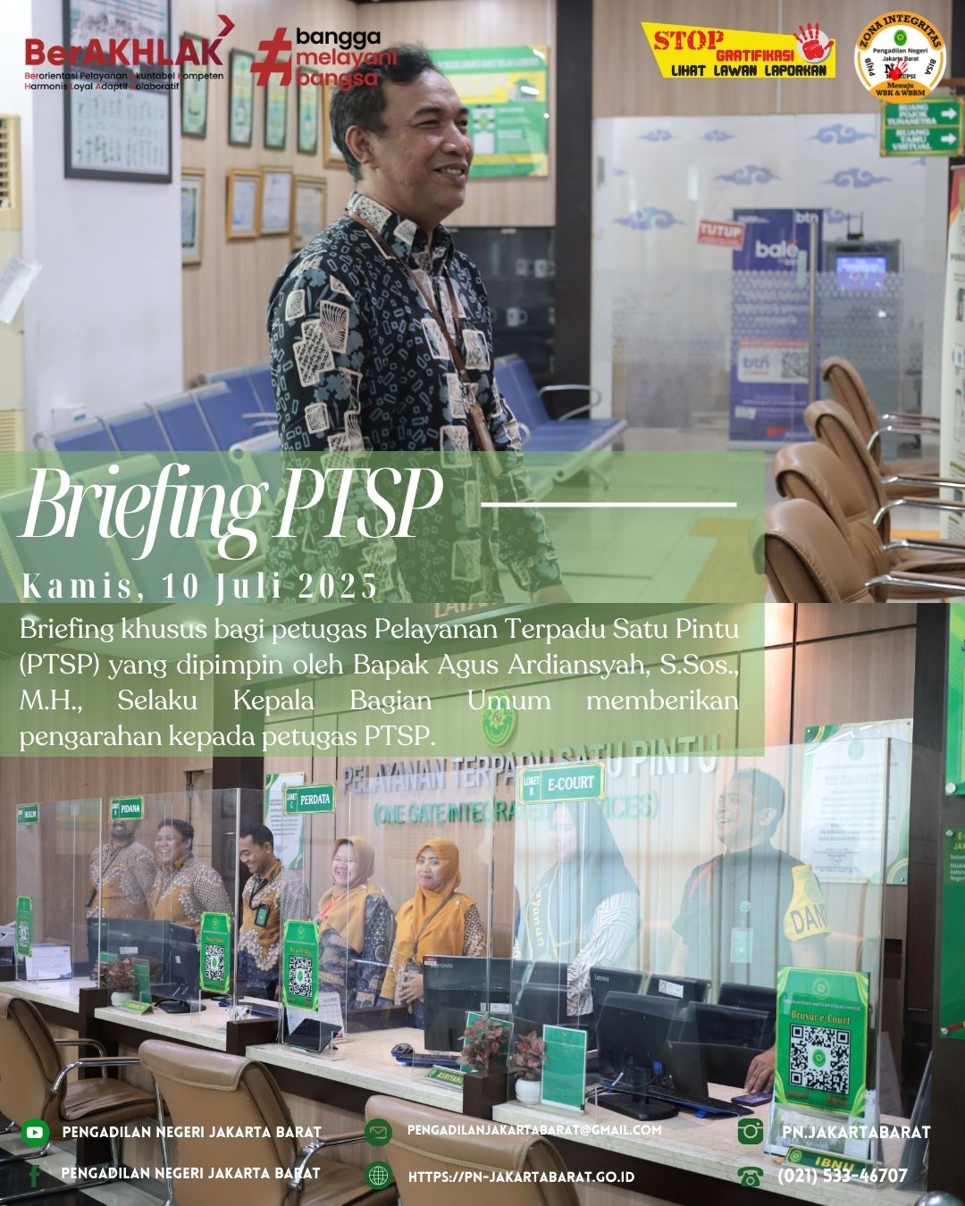 *PNJB, 10 Juli 2025* - Bertempat di lobi PTSP Pengadilan Negeri Jakarta Barat, telah diadakan briefing khusus bagi petugas Pelayanan Terpadu Satu Pintu (PTSP) yang dipimpin oleh Bapak Agus Ardiansyah S.Sos., M.H., selaku Kepala Bagian Umum