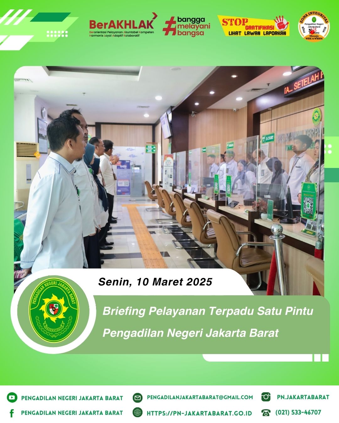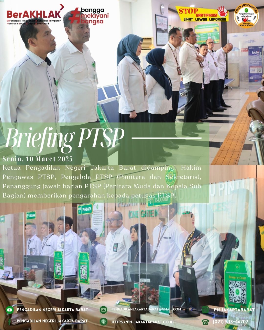*PNJB, 10 Maret 2025* Briefing Pelayanan Terpadu Satu Pintu (PTSP) yang berlangsung di lobi PTSP Pengadilan Negeri Jakarta Barat dipimpin oleh Ketua Pengadilan Negeri Jakarta Barat, Bapak Dr. Dahlan, S.H., M.H., didampingi oleh Bapak Demi Hadiantoro, S.H., M.H., dan Ibu Febri Purnamavita, S.H., M.H., selaku Hakim Pengawas PTSP, Panitera dan Sekretaris selaku pengelola PTSP, serta para Panitera Muda dan Kepala Sub Bagian selaku penanggung jawab harian.