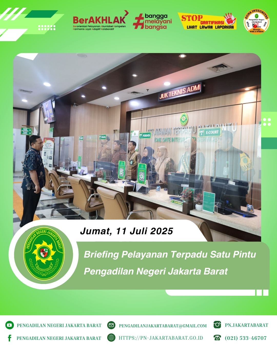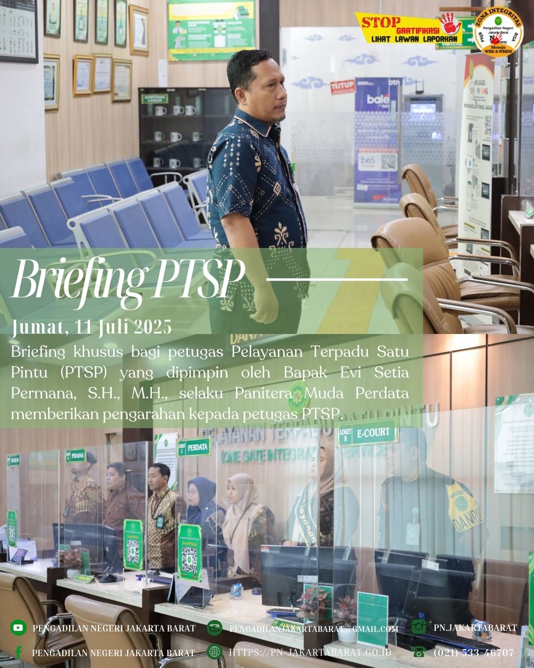 *PNJB, 11 Juli 2025* - Bertempat di lobi PTSP Pengadilan Negeri Jakarta Barat, telah diadakan briefing khusus bagi petugas Pelayanan Terpadu Satu Pintu (PTSP) yang dipimpin oleh Panitera Muda Perdata, Bapak Evi Setia Permana, S.H., M.H.