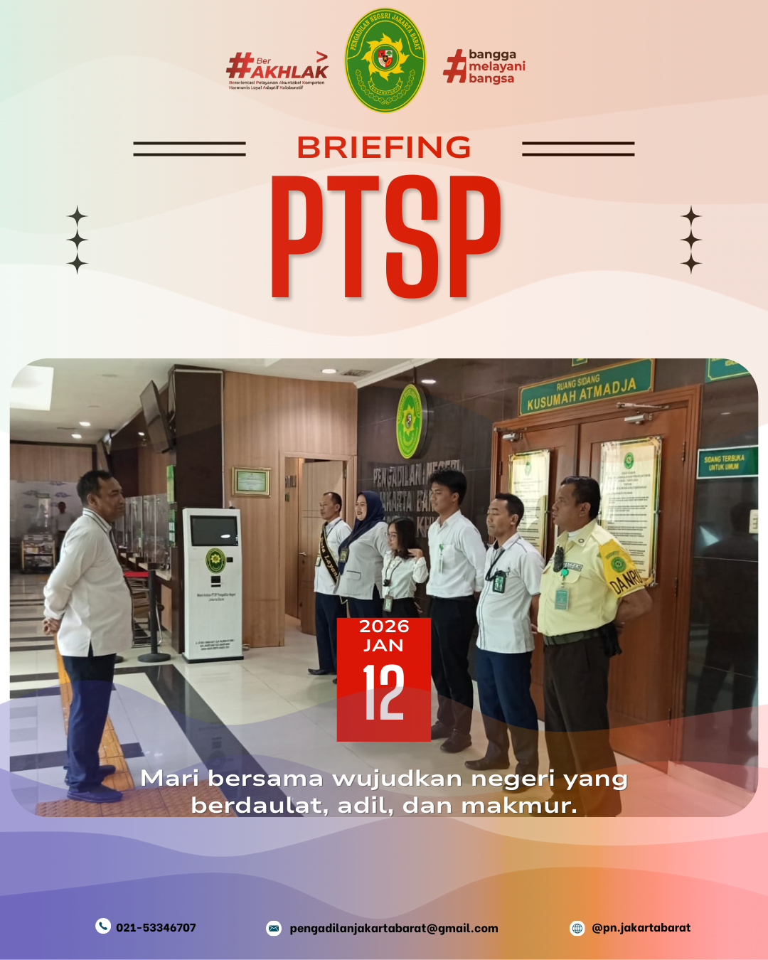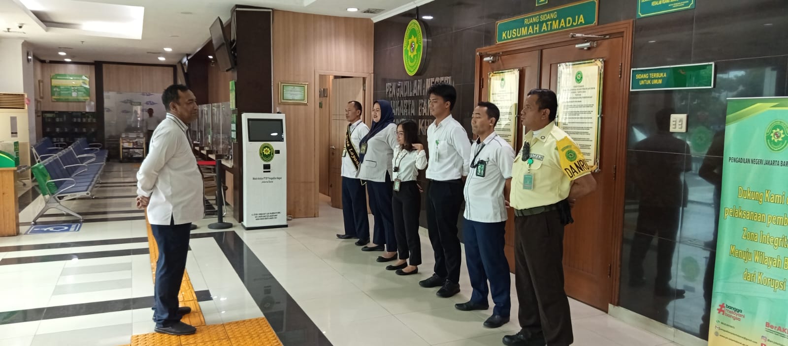 Briefing Pelayanan Terpadu Satu Pintu (PTSP) yang berlangsung di lobi PTSP Pengadilan Negeri Jakarta Barat dipimpin oleh Panitera Muda Pidana Pengadilan Negeri Jakarta Barat, Bapak Agus Ardiansyah S.Sos., M.H., selaku Pengelola PTSP bersama dengan Wakil Ketua, Kabag Umum dan Penanggung jawab harian PTSP (Kepala Sub Bagian) memberikan pengarahan kepada petugas PTSP.