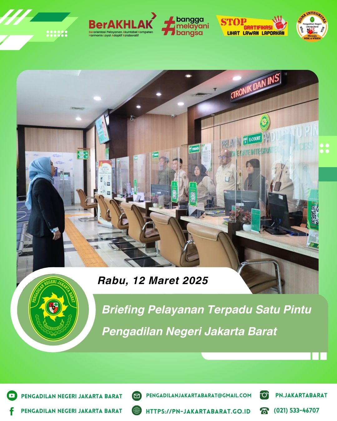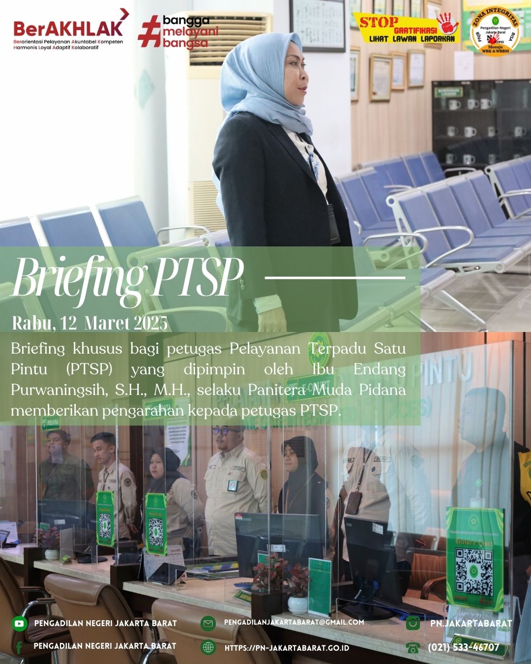 *PNJB, 12 Maret 2025* - Bertempat di lobi PTSP Pengadilan Negeri Jakarta Barat, telah diadakan briefing khusus bagi petugas Pelayanan Terpadu Satu Pintu (PTSP) yang dipimpin oleh Panitera Muda Pidana, Ibu Endang Purwaningsih, S.H., M.H.