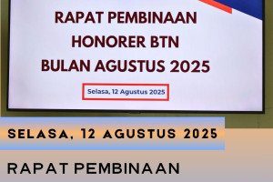 Jakarta, 12 Agustus 2025 Hari ini telah berlangsung Rapat Pembinaan Honorer BTN Bulan Agustus 2025 yang dipimpin oleh Sekretaris, Ibu Leliana Sari Harahap, S.H., M.H., didampingi oleh Kabag Umum, Bapak Agus Ardiansyah, S.Sos., M.H., Kasubag Tata Usaha dan Keuangan, Bapak Komarudin, S.E., M.Si. Rapat membahas seputar tentang kode etik honorer, tugas dan tanggung…