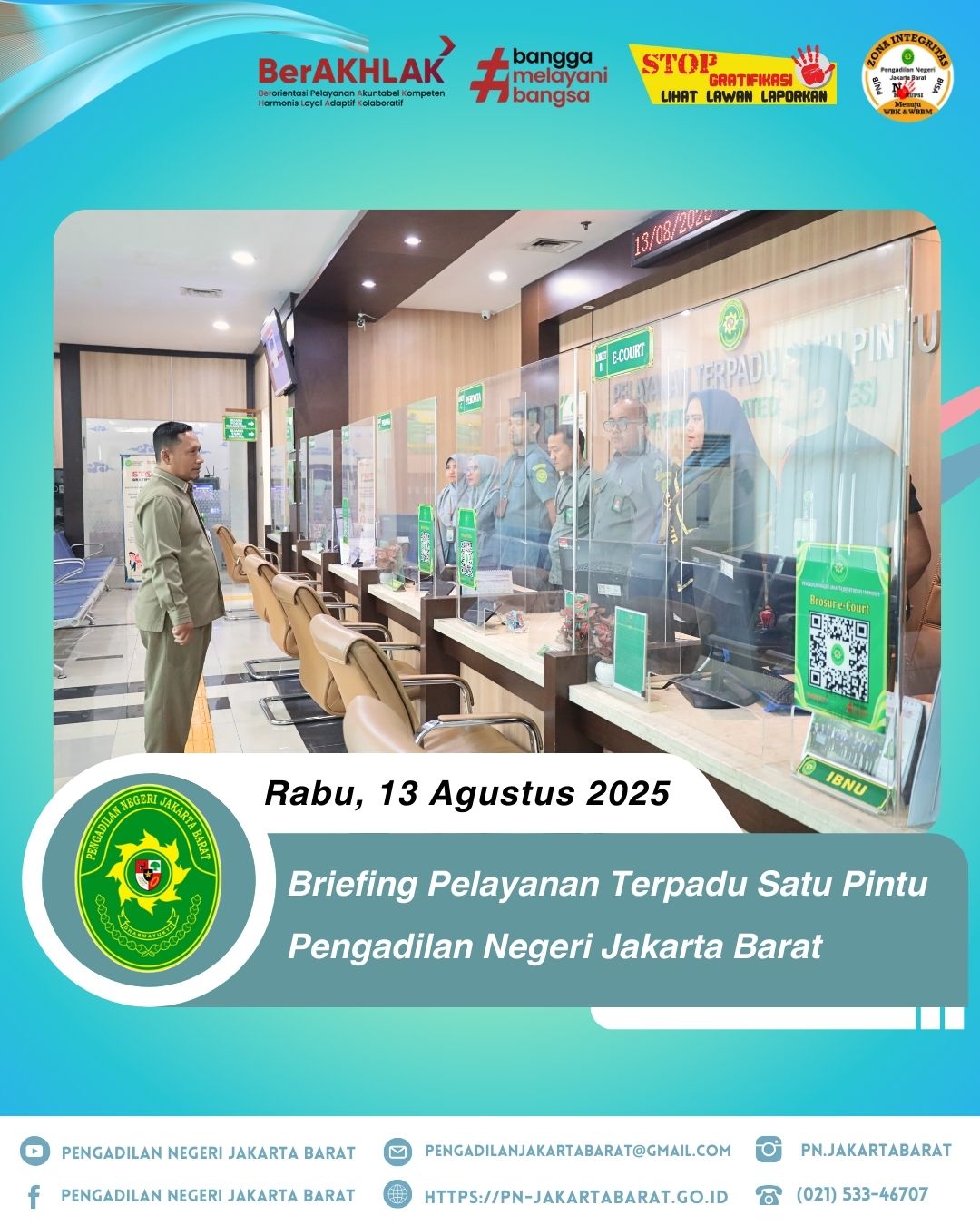 Bertempat di lobi PTSP Pengadilan Negeri Jakarta Barat Kelas IA Khusus, telah diadakan briefing khusus bagi petugas Pelayanan Terpadu Satu Pintu (PTSP) yang dipimpin oleh Panitera Muda Perdata, Bapak Evi Setia Permana, S.H., M.H.