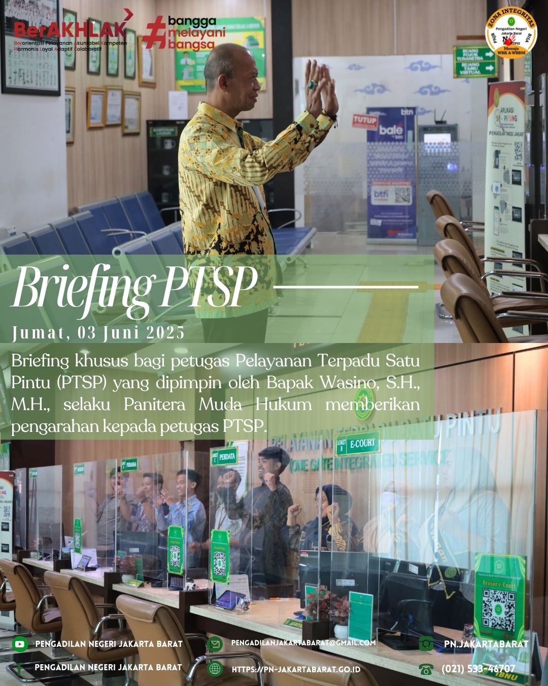 Bapak Wasino, S.H., M.H., juga berharap, melalui briefing ini, petugas PTSP dapat lebih memahami tugas dan tanggung jawab mereka dengan baik, serta mampu memberikan pelayanan yang prima kepada masyarakat. Keterlibatan seluruh lapisan internal diharapkan dapat meningkatkan sinergi dalam menjalankan fungsi PTSP sebagai ujung tombak pelayanan hukum di Pengadilan Negeri Jakarta Barat.