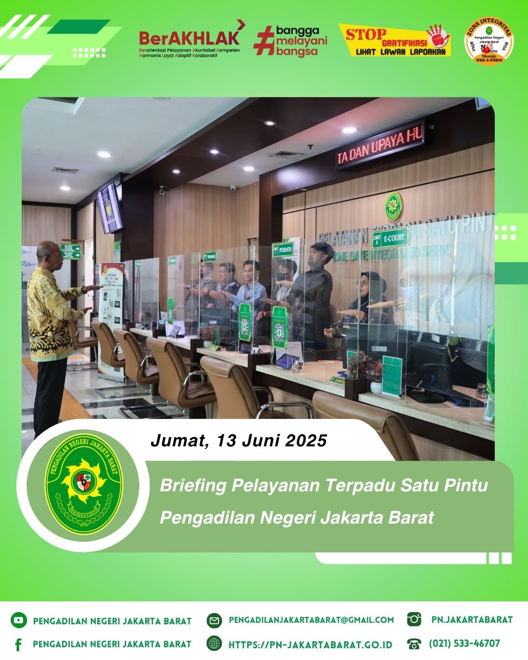 *PNJB, 13 Juni 2025* - Bertempat di lobi PTSP Pengadilan Negeri Jakarta Barat, telah diadakan briefing khusus bagi petugas Pelayanan Terpadu Satu Pintu (PTSP) yang dipimpin oleh Panitera Muda Hukum, Bapak Wasino, S.H., M.H.