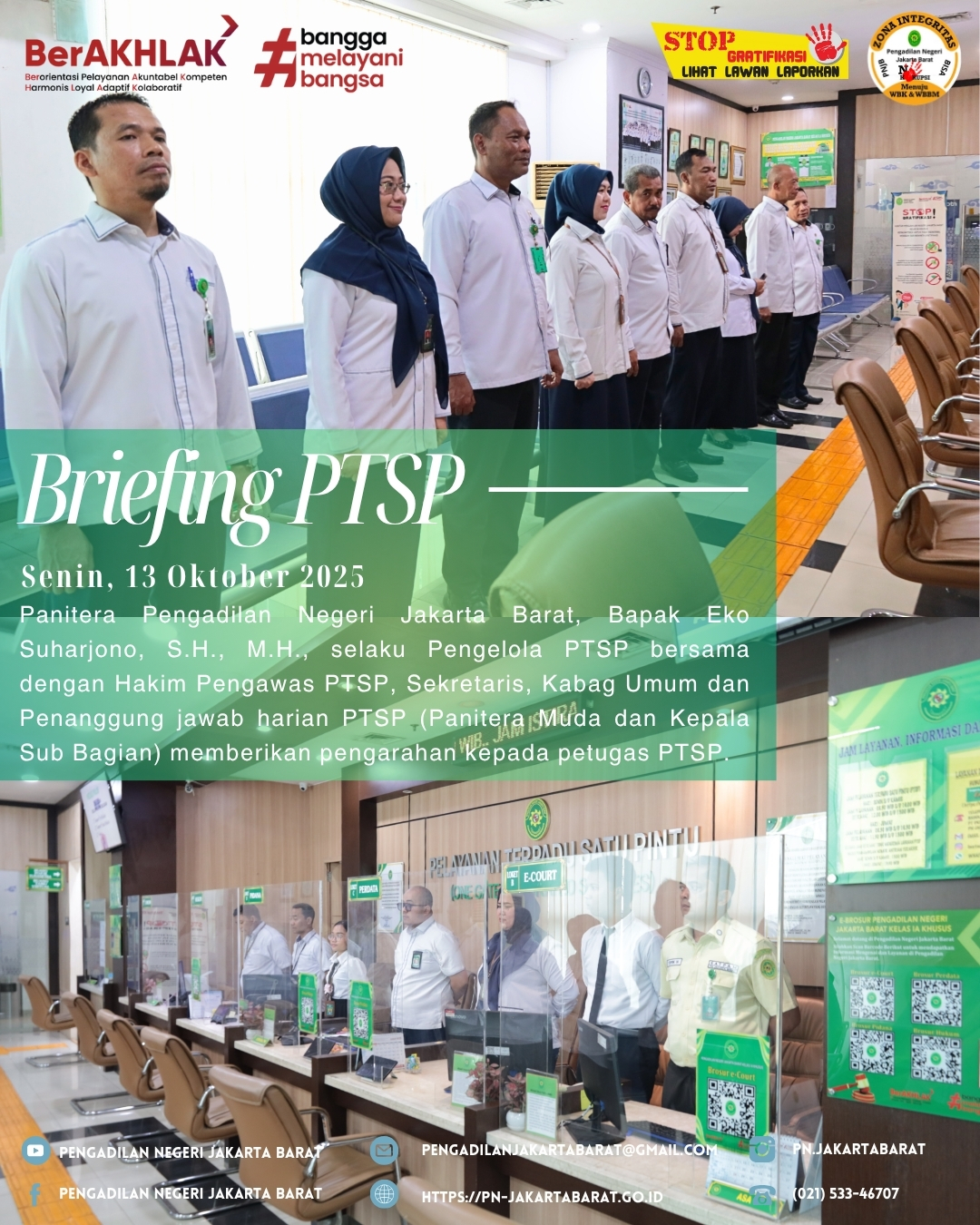 Briefing Pelayanan Terpadu Satu Pintu (PTSP) yang berlangsung di lobi PTSP Pengadilan Negeri Jakarta Barat dipimpin oleh Panitera Pengadilan Negeri Jakarta Barat, Bapak Eko Suharjono, S.H., M.H., selaku Pengelola PTSP bersama dengan Hakim Pengawas PTSP, Kabag Umum dan Penanggung jawab harian PTSP (Panitera Muda dan Kepala Sub Bagian) memberikan pengarahan kepada petugas PTSP.