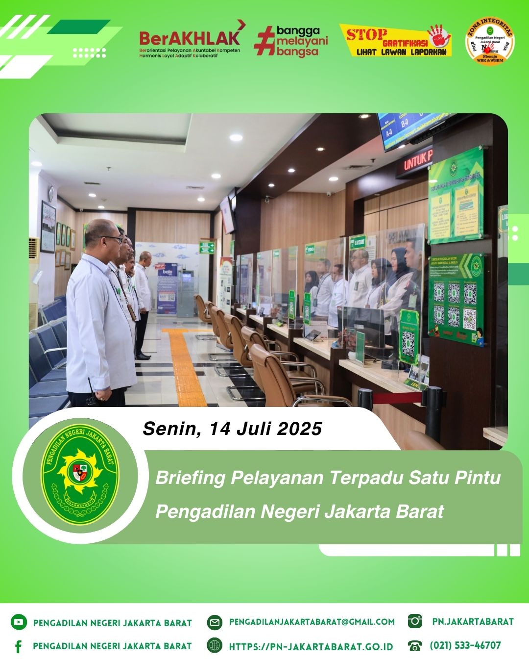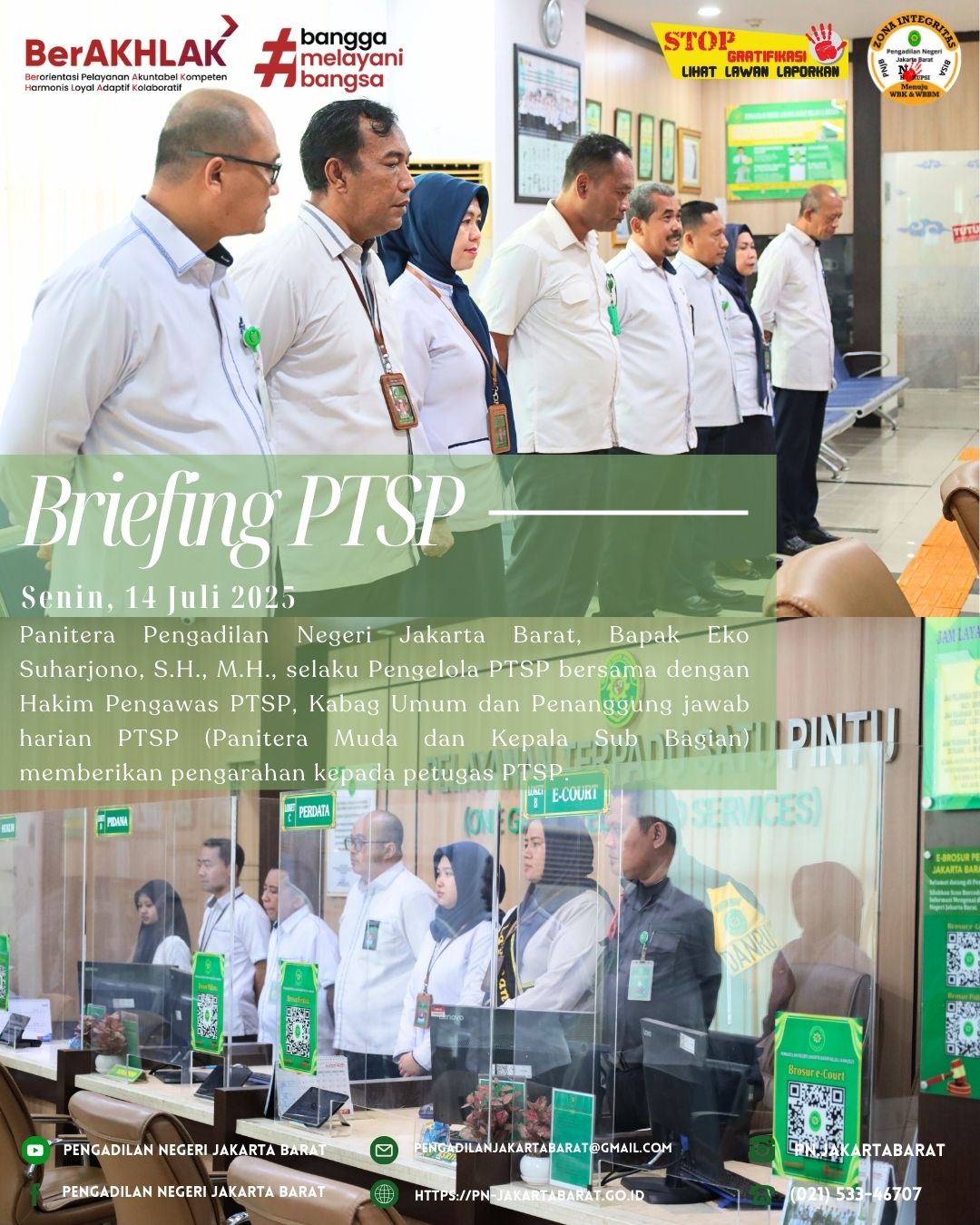 *PNJB, 14 Juli 2025* Briefing Pelayanan Terpadu Satu Pintu (PTSP) yang berlangsung di lobi PTSP Pengadilan Negeri Jakarta Barat dipimpin oleh Panitera Pengadilan Negeri Jakarta Barat, Bapak Eko Suharjono, S.H., M.H., selaku Pengelola PTSP bersama dengan Hakim Pengawas PTSP, Kabag Umum dan Penanggung jawab harian PTSP (Panitera Muda dan Kepala Sub Bagian) memberikan pengarahan kepada petugas PTSP.