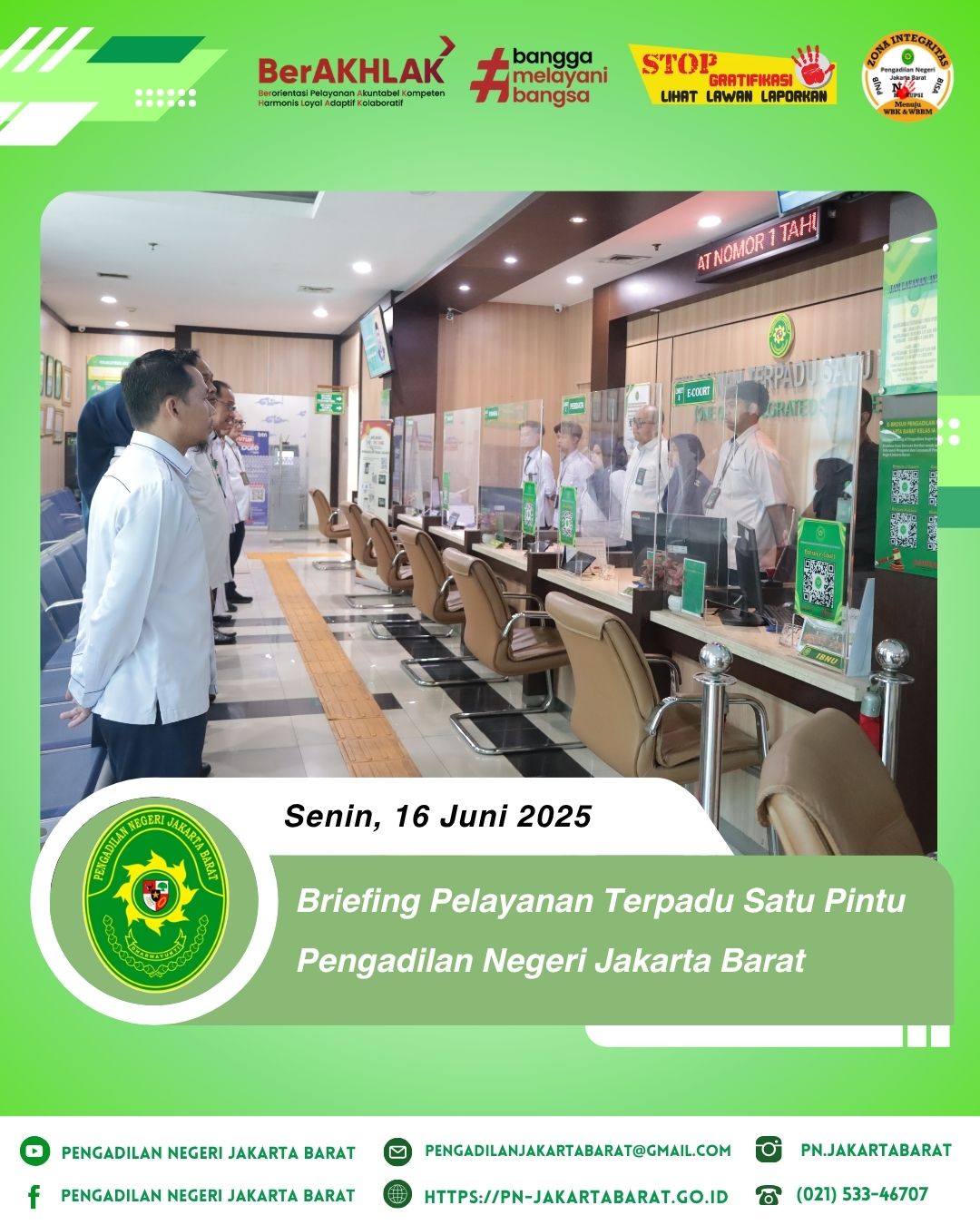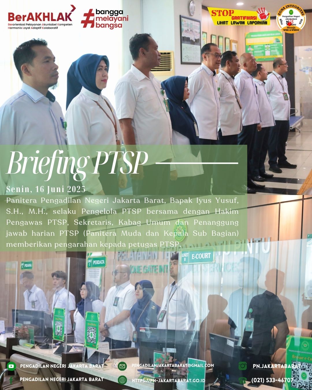*PNJB, 16 Juni 2025* Briefing Pelayanan Terpadu Satu Pintu (PTSP) yang berlangsung di lobi PTSP Pengadilan Negeri Jakarta Barat dipimpin oleh Panitera Pengadilan Negeri Jakarta Barat, Bapak Iyus Yusuf, S.H., M.H., selaku Pengelola PTSP bersama dengan Hakim Pengawas PTSP, Sekretaris, Kabag Umum dan Penanggung jawab harian PTSP (Panitera Muda dan Kepala Sub Bagian) memberikan pengarahan kepada petugas PTSP.
