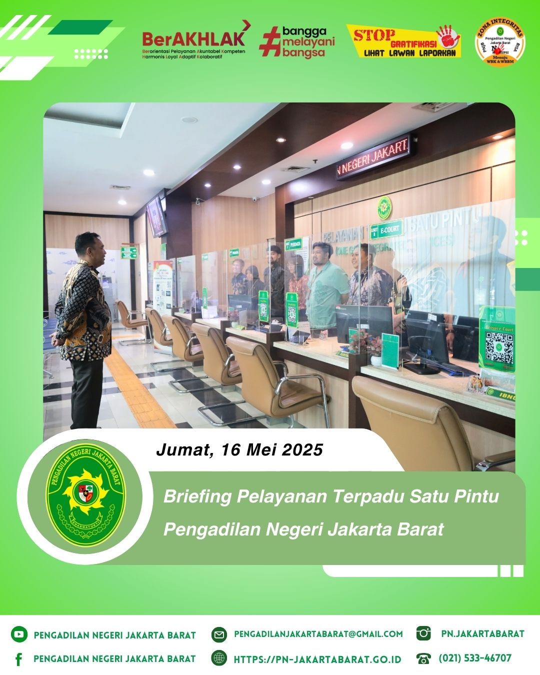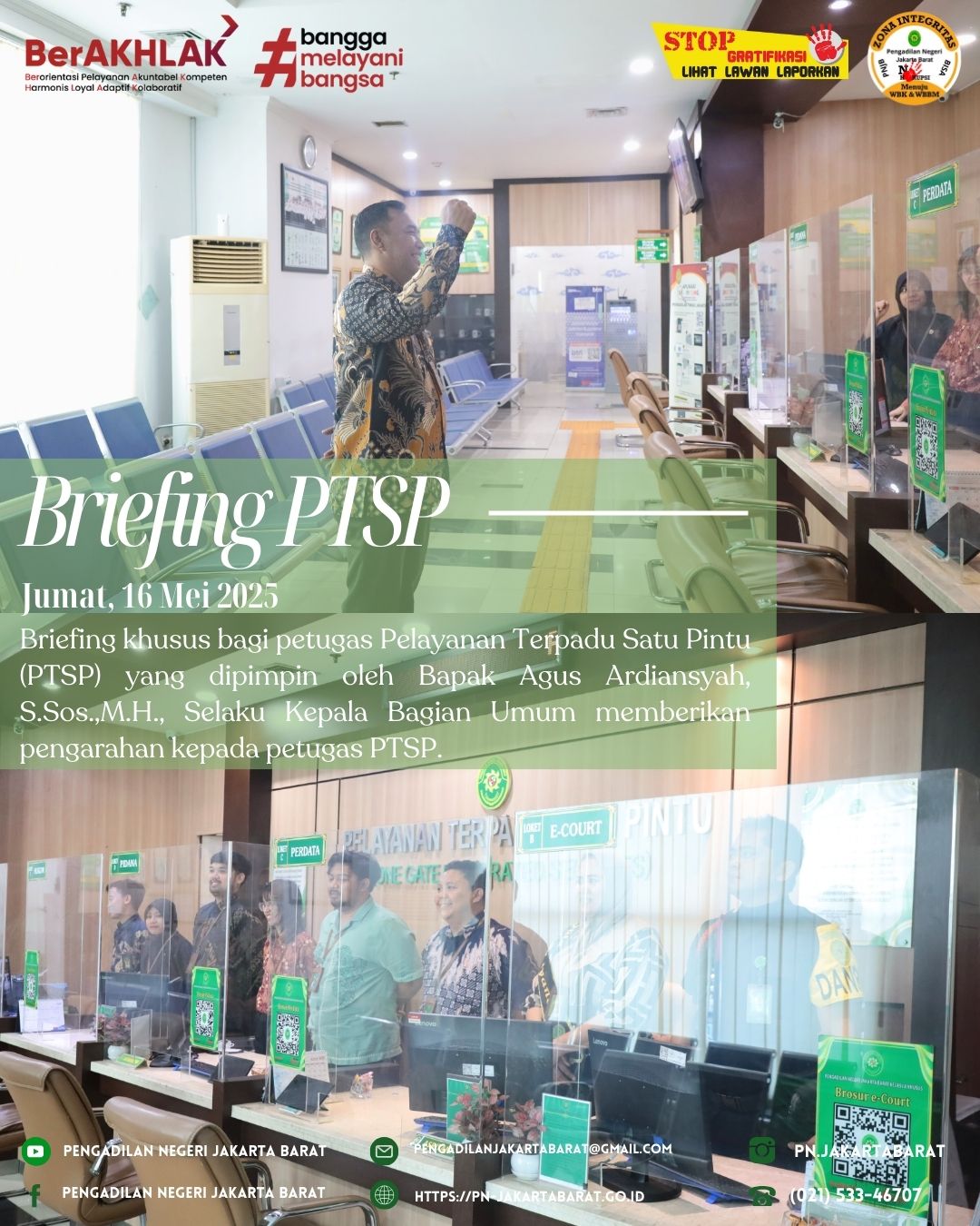 *PNJB, 16 Mei 2025* - Bertempat di lobi PTSP Pengadilan Negeri Jakarta Barat, telah diadakan briefing khusus bagi petugas Pelayanan Terpadu Satu Pintu (PTSP) yang dipimpin oleh Bapak Agus Ardiansyah S.Sos., M.H., selaku Kepala Bagian Umum