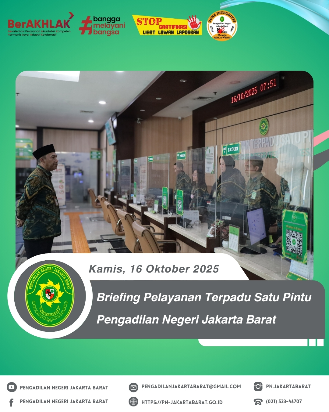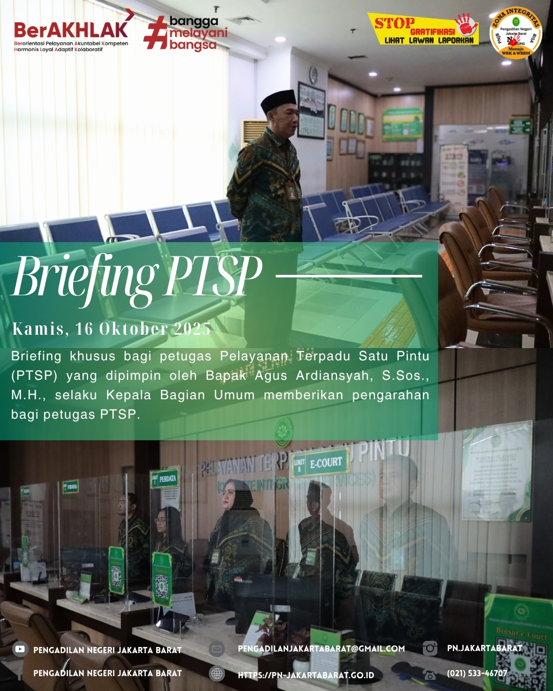 Bertempat di lobi PTSP Pengadilan Negeri Jakarta Barat Kelas IA Khusus, telah diadakan briefing khusus bagi petugas Pelayanan Terpadu Satu Pintu (PTSP) yang dipimpin oleh Bapak Agus Ardiansyah S.Sos., M.H., selaku Kepala Bagian Umum