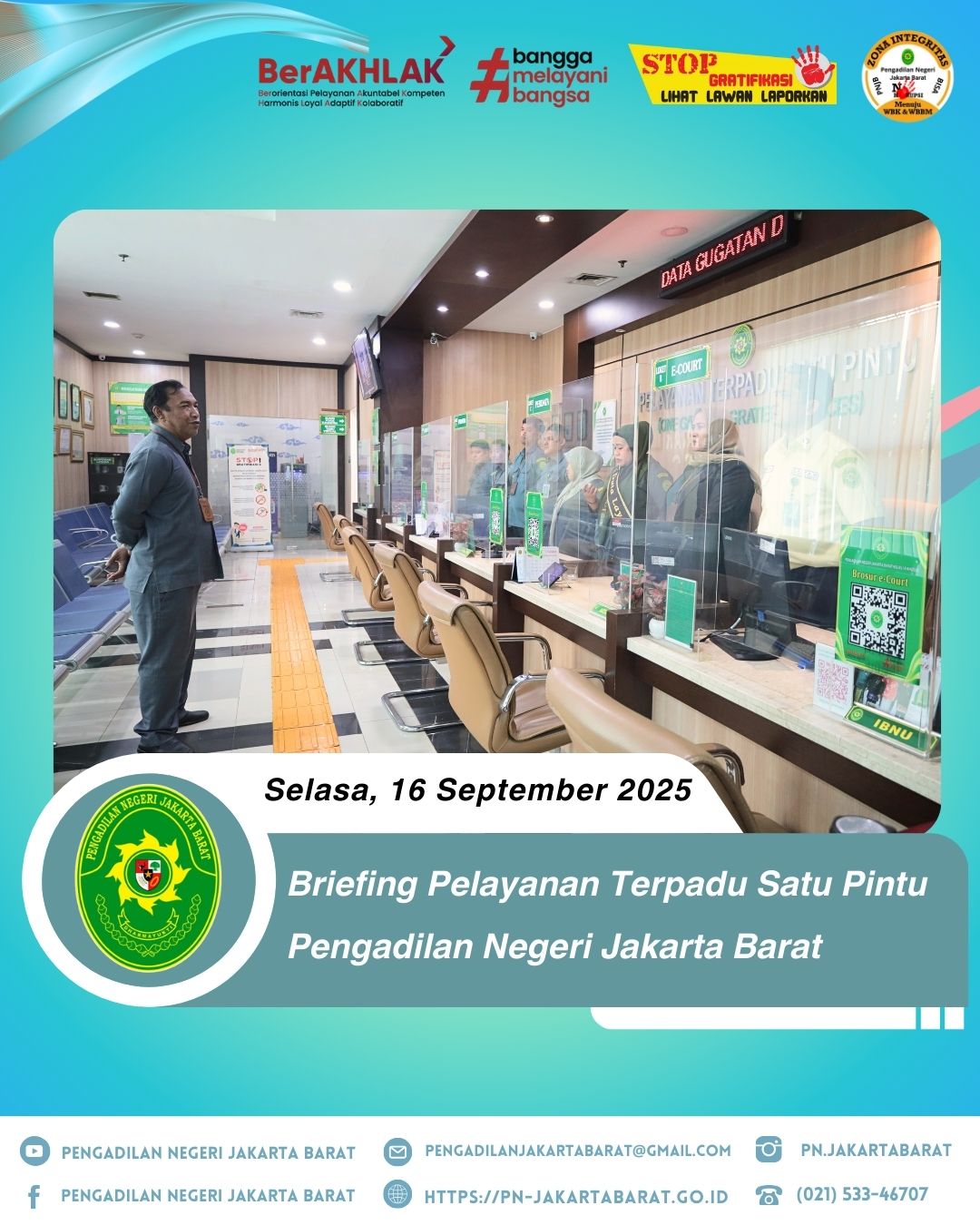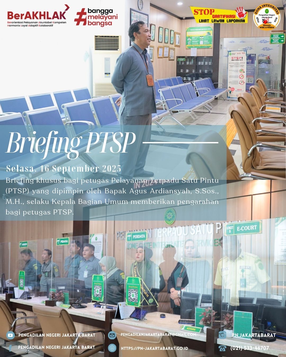 Bertempat di lobi PTSP Pengadilan Negeri Jakarta Barat Kelas IA Khusus, telah diadakan briefing khusus bagi petugas Pelayanan Terpadu Satu Pintu (PTSP) yang dipimpin oleh Bapak Agus Ardiansyah S.Sos., M.H., selaku Kepala Bagian Umum