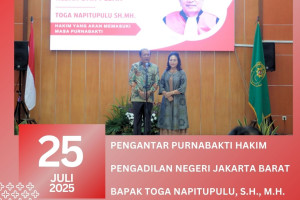 Jakarta, 25 Juli 2025 Pengadilan Negeri Jakarta Barat melaksanakan Pengantar Purbakti Hakim, Bapak Toga Napitupulu, S.H., M.H., yang akan memasuki masa Purnabakti. Acara dibuka doa dan sambutan dari Ketua Pengadilan Negeri Jakarta Barat, Bapak Moehammad Pandji Santoso, S.H., M.H., yang menyampaikan rasa hormat dan terima kasih atas dedikasi serta kontribusi Bapak…