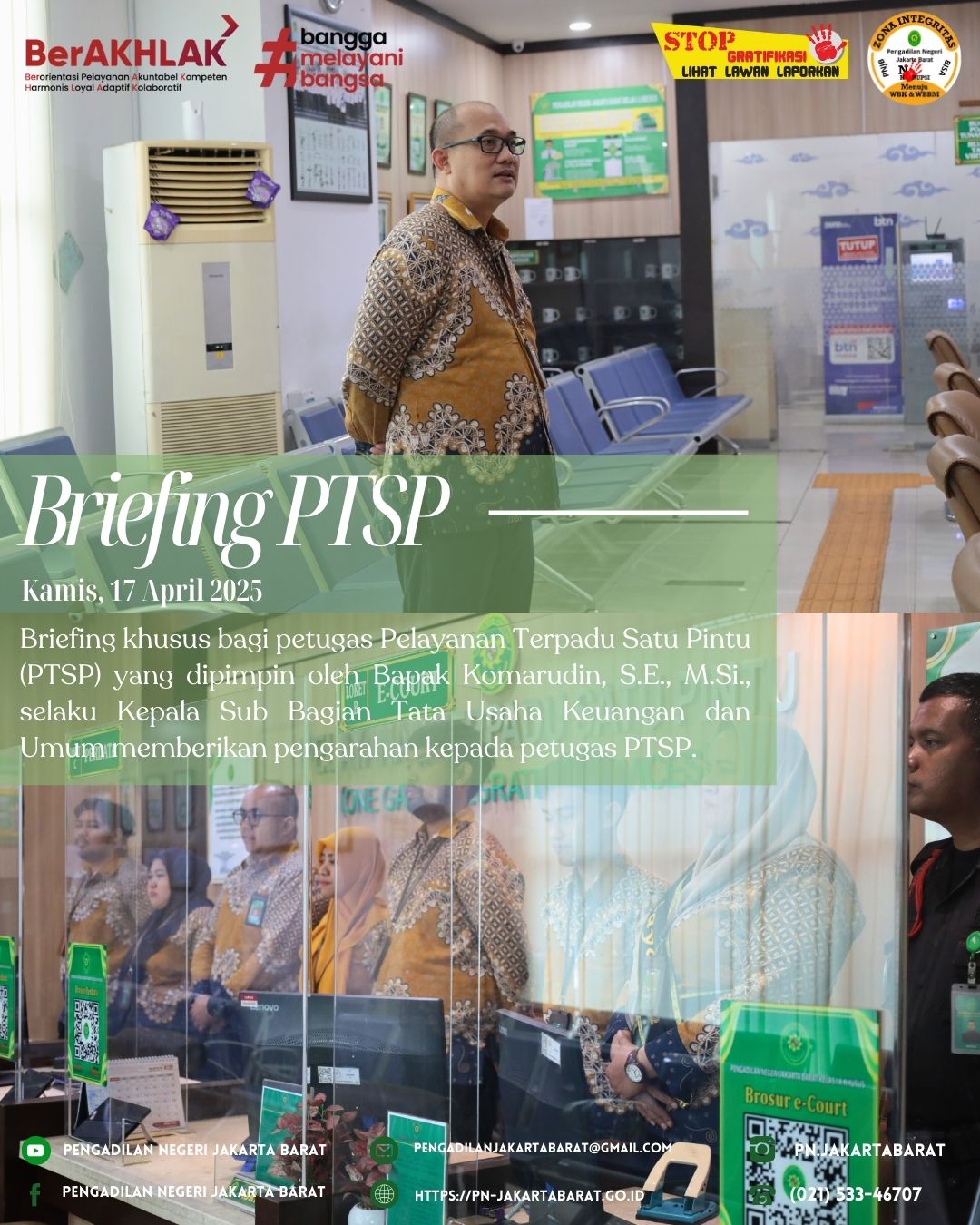 *PNJB, 17 April 2025* - Bertempat di lobi PTSP Pengadilan Negeri Jakarta Barat, telah dilaksanakan briefing khusus bagi petugas Pelayanan Terpadu Satu Pintu (PTSP) yang dipimpin oleh Bapak Komarudin, S.E., M.Si., selaku Kepala Sub Bagian Tata Usaha Keuangan dan Umum.