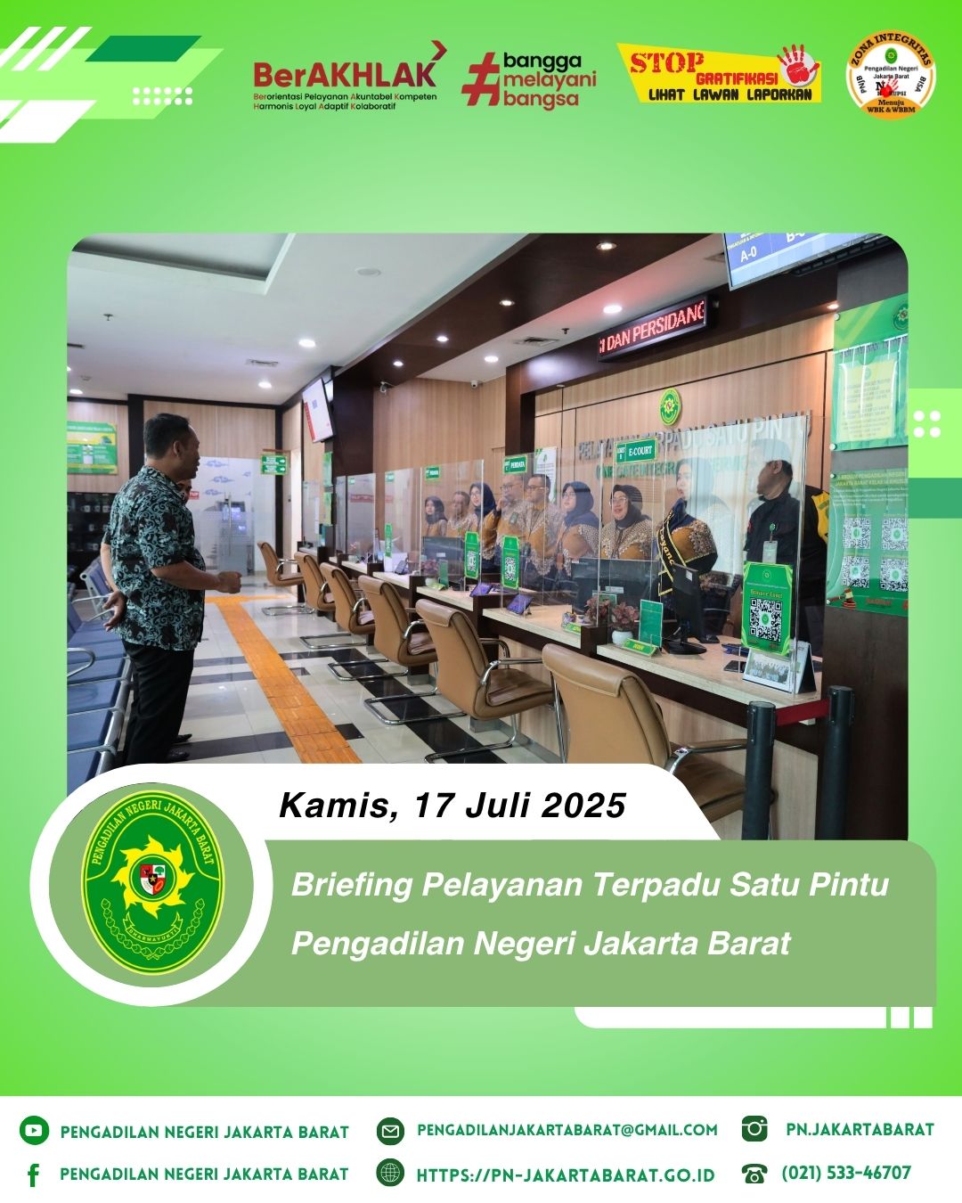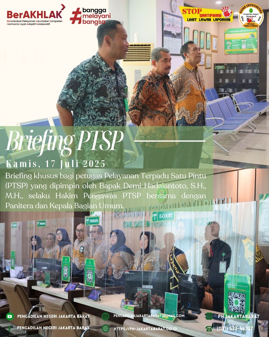 Bertempat di lobi PTSP Pengadilan Negeri Jakarta Barat, telah diadakan briefing khusus bagi petugas Pelayanan Terpadu Satu Pintu (PTSP) yang dipimpin oleh Bapak Demi Hadiantoro, S.H., M.H., selaku Hakim Pengawas PTSP bersama dengan Panitera dan Kabag Umum.