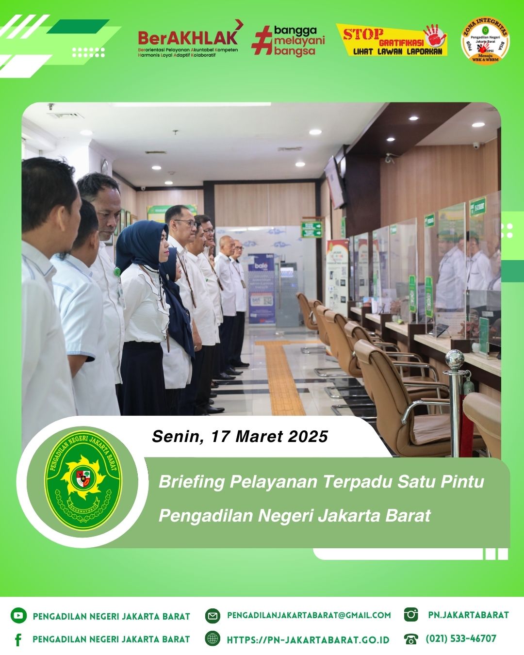 *PNJB, 17 Maret 2025* Briefing Pelayanan Terpadu Satu Pintu (PTSP) yang berlangsung di lobi PTSP Pengadilan Negeri Jakarta Barat dipimpin oleh Ketua Pengadilan Negeri Jakarta Barat, Bapak Dr. Dahlan, S.H., M.H., dan Wakil Ketua Pengadilan Negeri Jakarta Barat, Bapak Achmad Satibi, S.H., M.H., bersama Bapak Demi Hadiantoro, S.H., M.H., dan Ibu Febri Purnamavita, S.H., M.H., selaku Hakim Pengawas PTSP, Panitera dan Sekretaris selaku pengelola PTSP, serta para Panitera Muda dan Kepala Sub Bagian selaku penanggung jawab harian.