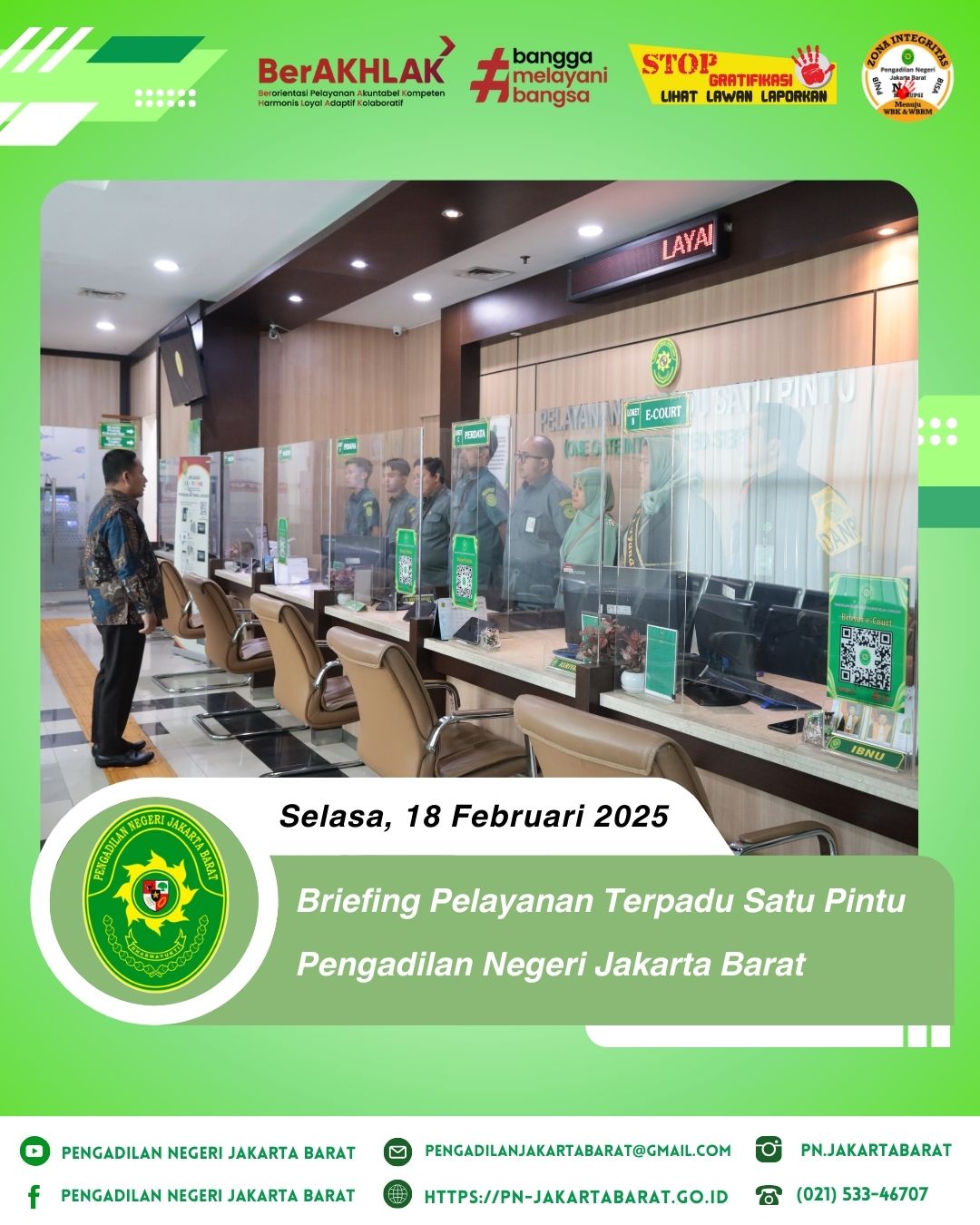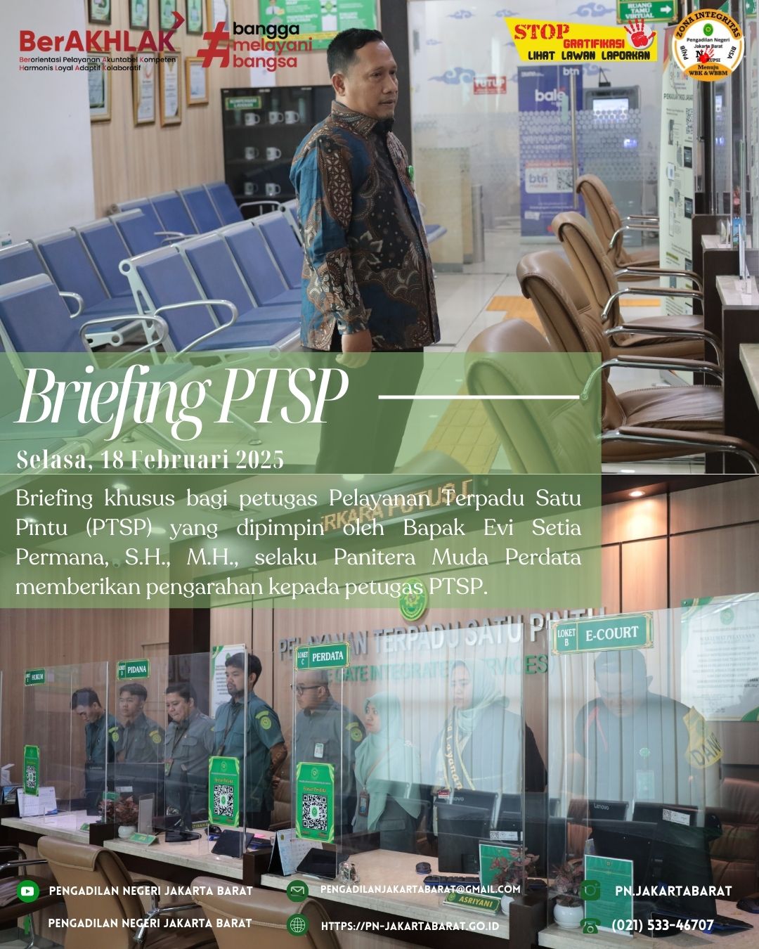 *PNJB, 18 Februari 2025* - Bertempat di lobi PTSP Pengadilan Negeri Jakarta Barat, telah diadakan briefing khusus bagi petugas Pelayanan Terpadu Satu Pintu (PTSP) yang dipimpin oleh Panitera Muda Perdata, Bapak Evi Setia Permana, S.H., M.H.