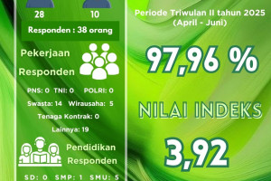 Nilai Indeks Persepsi Anti Korupsi Pengadilan Negeri Jakarta Barat Kelas IA Khusus, Periode Triwulan Ke-II, April s/d Juni 2025, adalah sebesar 97,96 % dengan Nilai Indeks 3,92 A (Sangat Baik), dari total responden sebanyak 38 Orang. #mahkamahagungri #badilummari #ptdkijakarta #pnjbbisa #berakhlak #banggamelayanibangsa