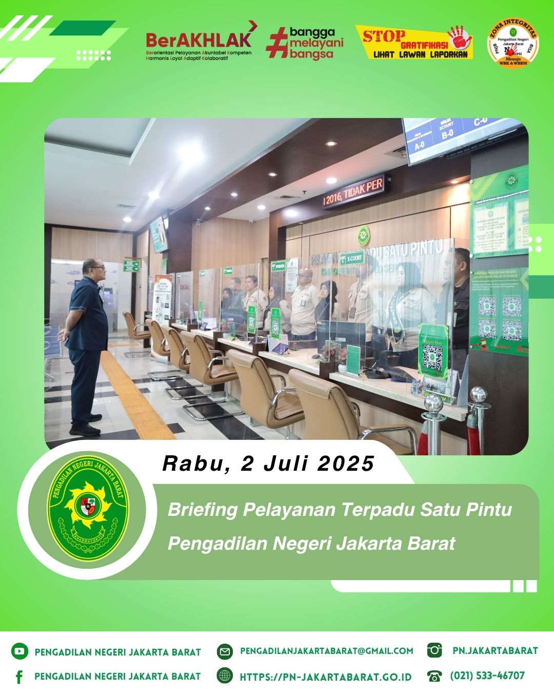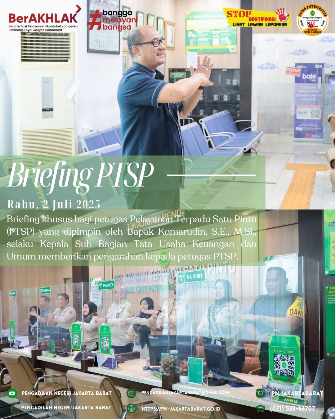 *PNJB, 2 Juli 2025* - Bertempat di lobi PTSP Pengadilan Negeri Jakarta Barat Kelas IA Khusus, telah diadakan briefing khusus bagi petugas Pelayanan Terpadu Satu Pintu (PTSP) yang dipimpin oleh Bapak Komarudin, S.E., M.Si., selaku Kepala Sub Bagian Tata Usaha Keuangan dan Umum.