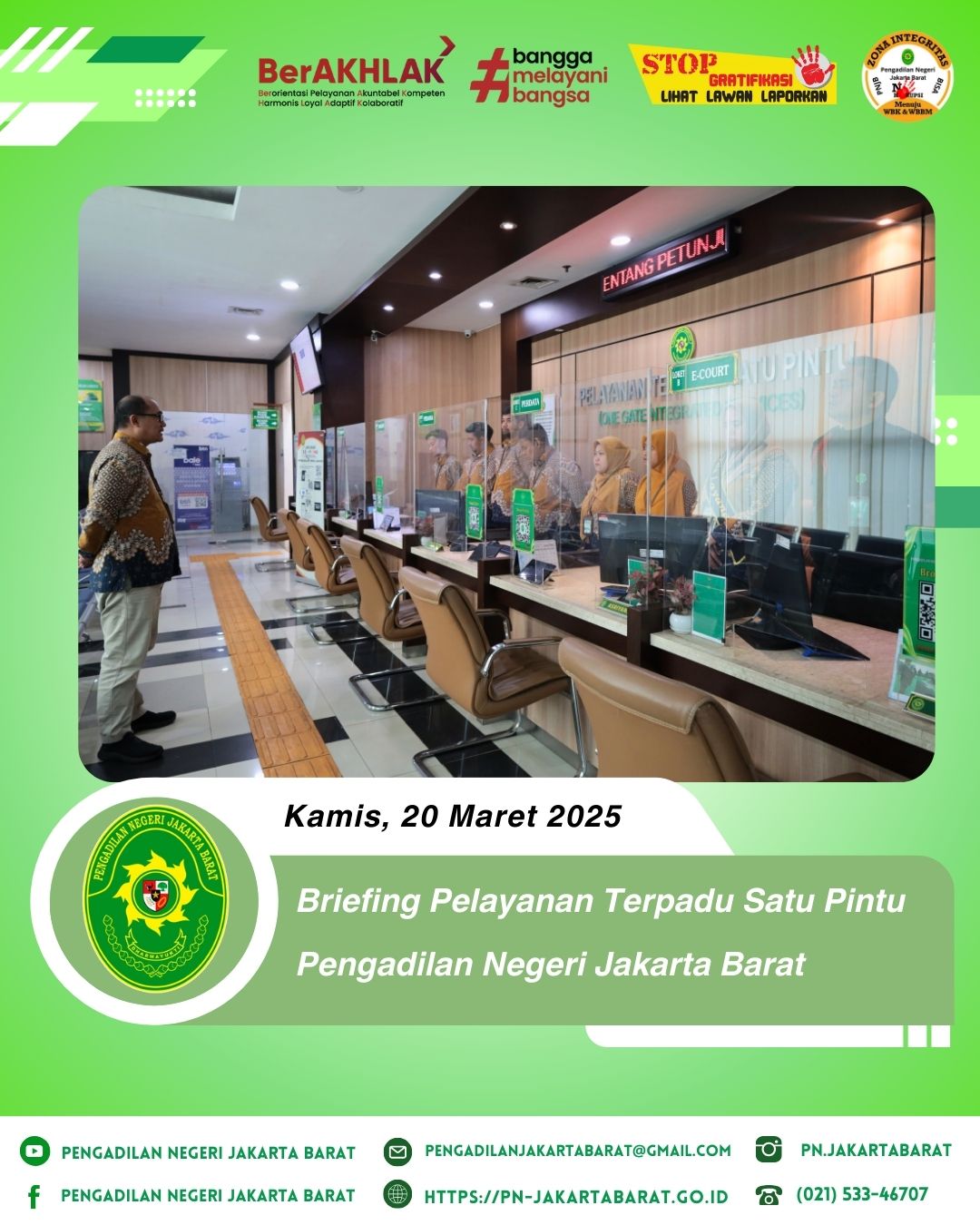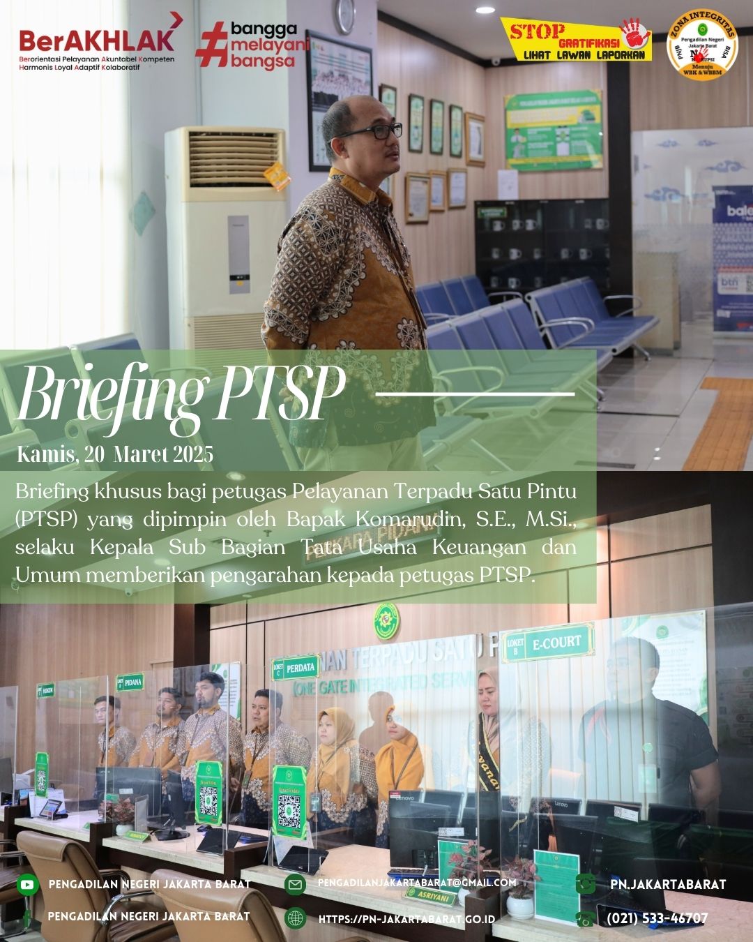 *PNJB, 20 Maret 2025* - Bertempat di lobi PTSP Pengadilan Negeri Jakarta Barat, telah diadakan briefing khusus bagi petugas Pelayanan Terpadu Satu Pintu (PTSP) yang dipimpin oleh Bapak Komarudin, S.E., M.Si., selaku Kepala Sub Bagian Tata Usaha Keuangan dan Umum.