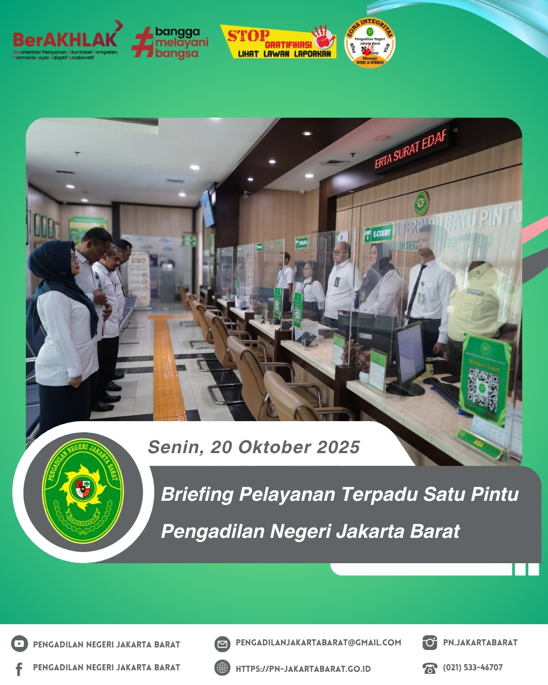 Briefing Pelayanan Terpadu Satu Pintu (PTSP) yang berlangsung di lobi PTSP Pengadilan Negeri Jakarta Barat dipimpin oleh Panitera Pengadilan Negeri Jakarta Barat, Bapak Eko Suharjono, S.H., M.H., selaku Pengelola PTSP bersama dengan Hakim Pengawas PTSP, Kabag Umum dan Penanggung jawab harian PTSP (Panitera Muda dan Kepala Sub Bagian) memberikan pengarahan kepada petugas PTSP.