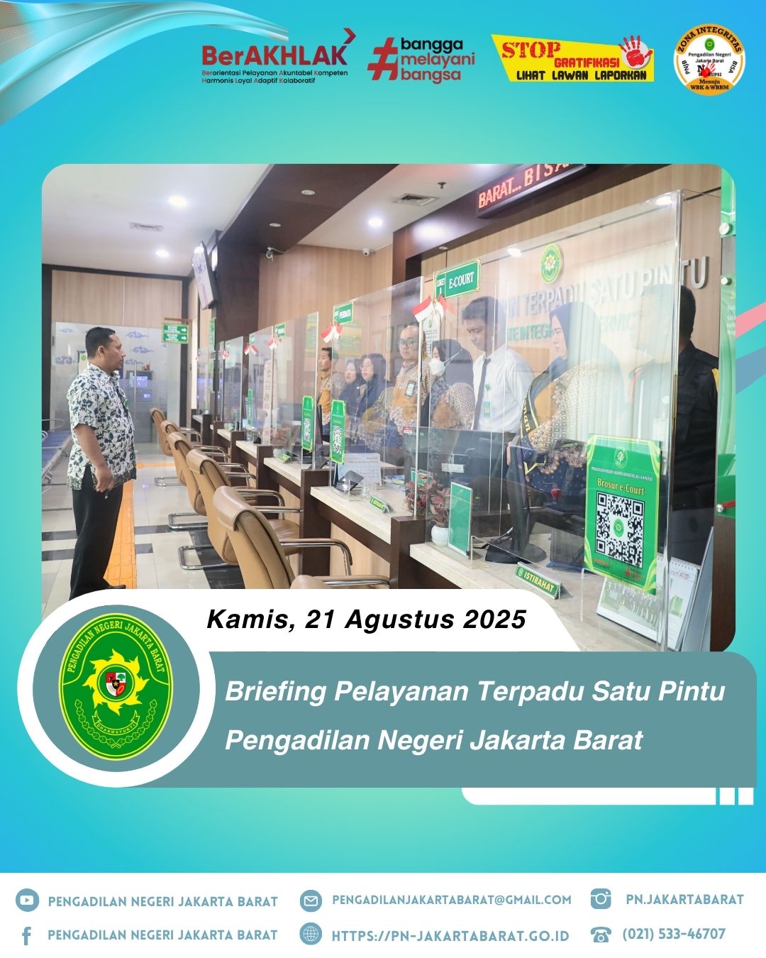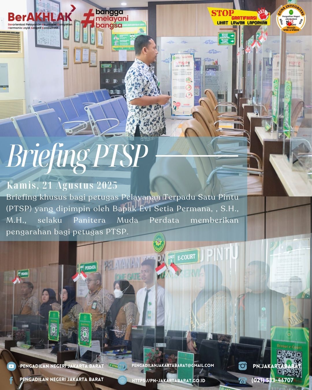Bertempat di lobi PTSP Pengadilan Negeri Jakarta Barat, telah diadakan briefing khusus bagi petugas Pelayanan Terpadu Satu Pintu (PTSP) yang dipimpin oleh Panitera Muda Perdata, Bapak Evi Setia Permana, S.H., M.H.
