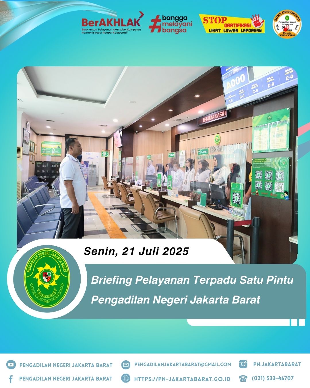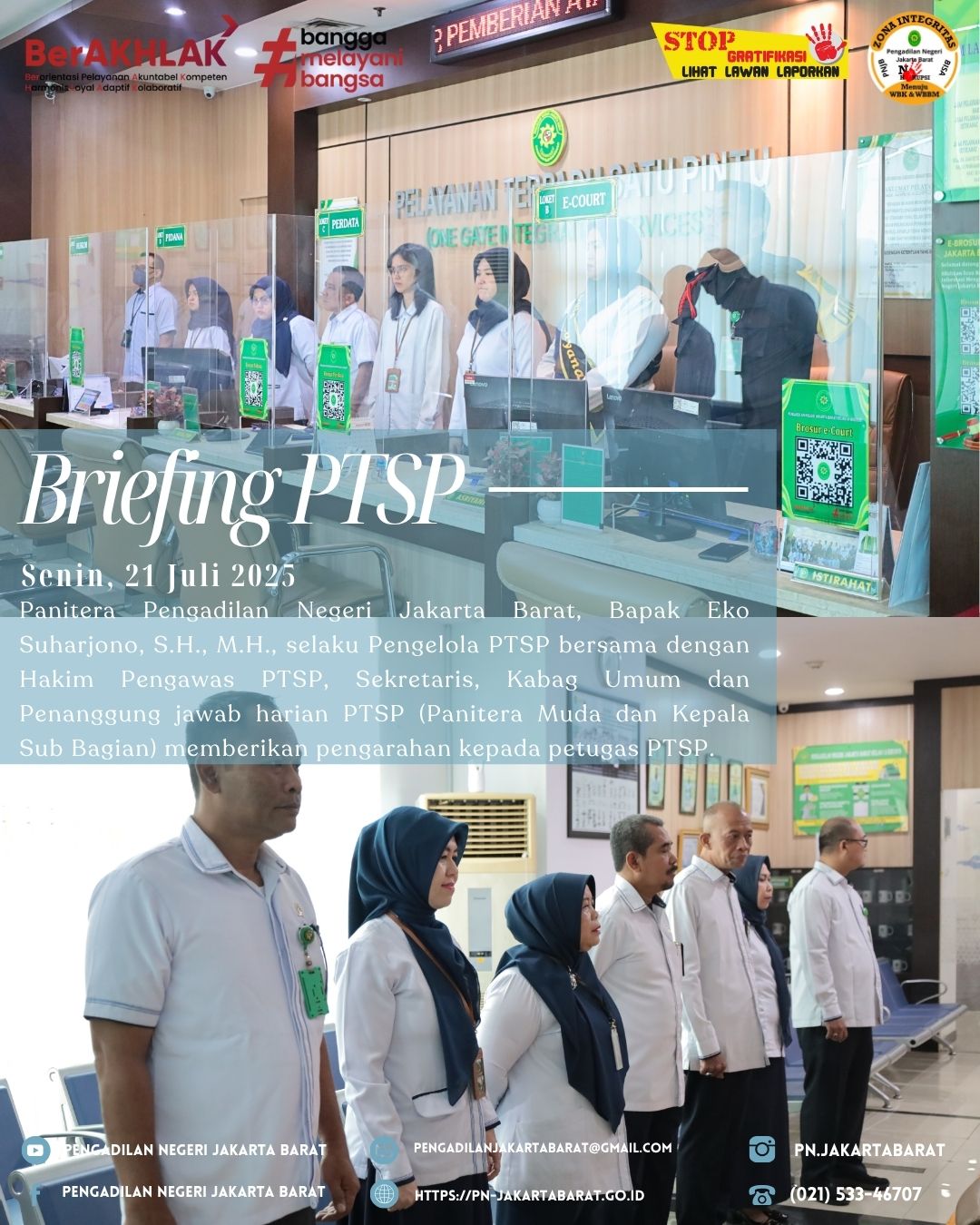 Briefing Pelayanan Terpadu Satu Pintu (PTSP) yang berlangsung di lobi PTSP Pengadilan Negeri Jakarta Barat dipimpin oleh Panitera Pengadilan Negeri Jakarta Barat, Bapak Eko Suharjono, S.H., M.H., selaku Pengelola PTSP bersama dengan Hakim Pengawas PTSP, Kabag Umum dan Penanggung jawab harian PTSP (Panitera Muda dan Kepala Sub Bagian) memberikan pengarahan kepada petugas PTSP.