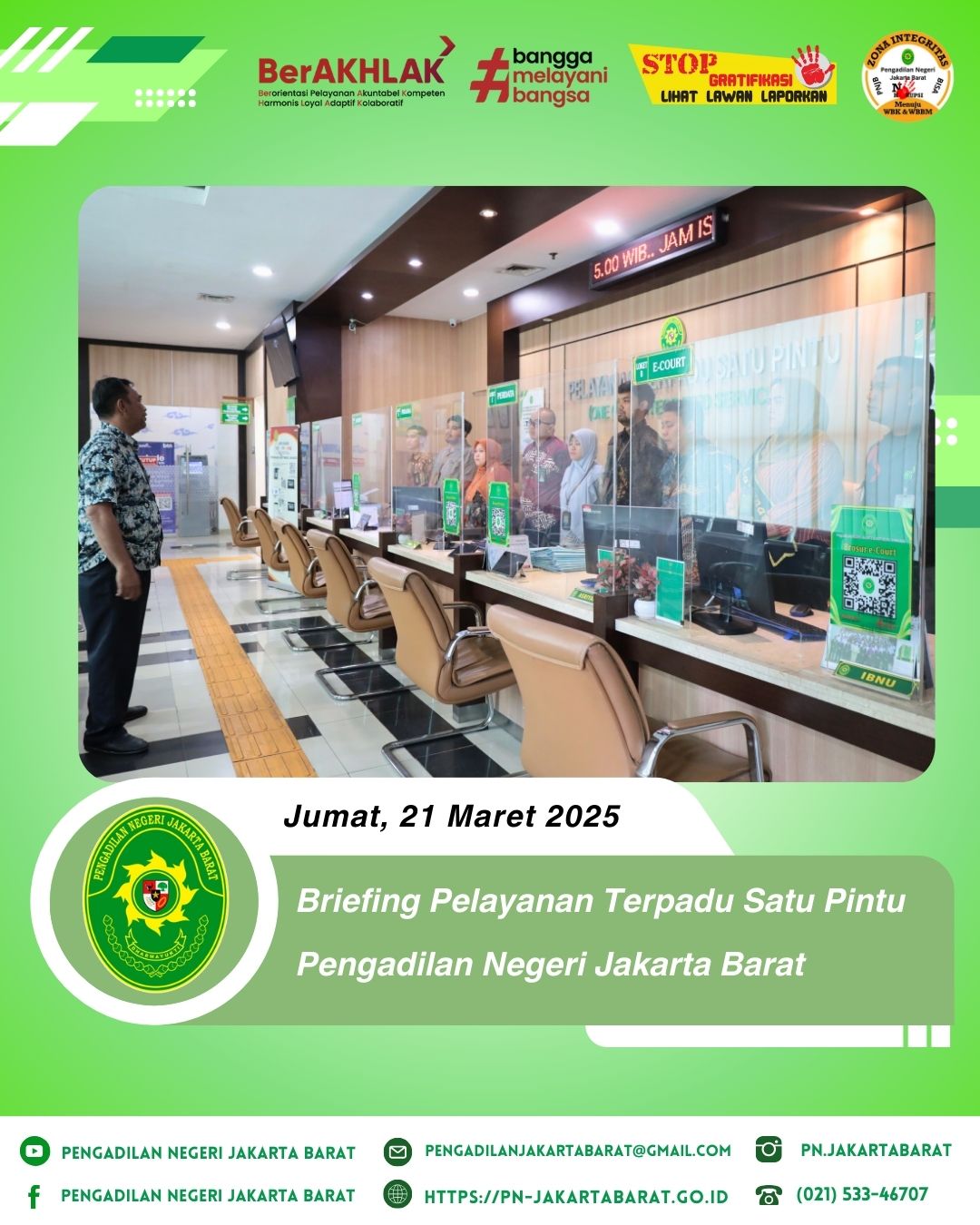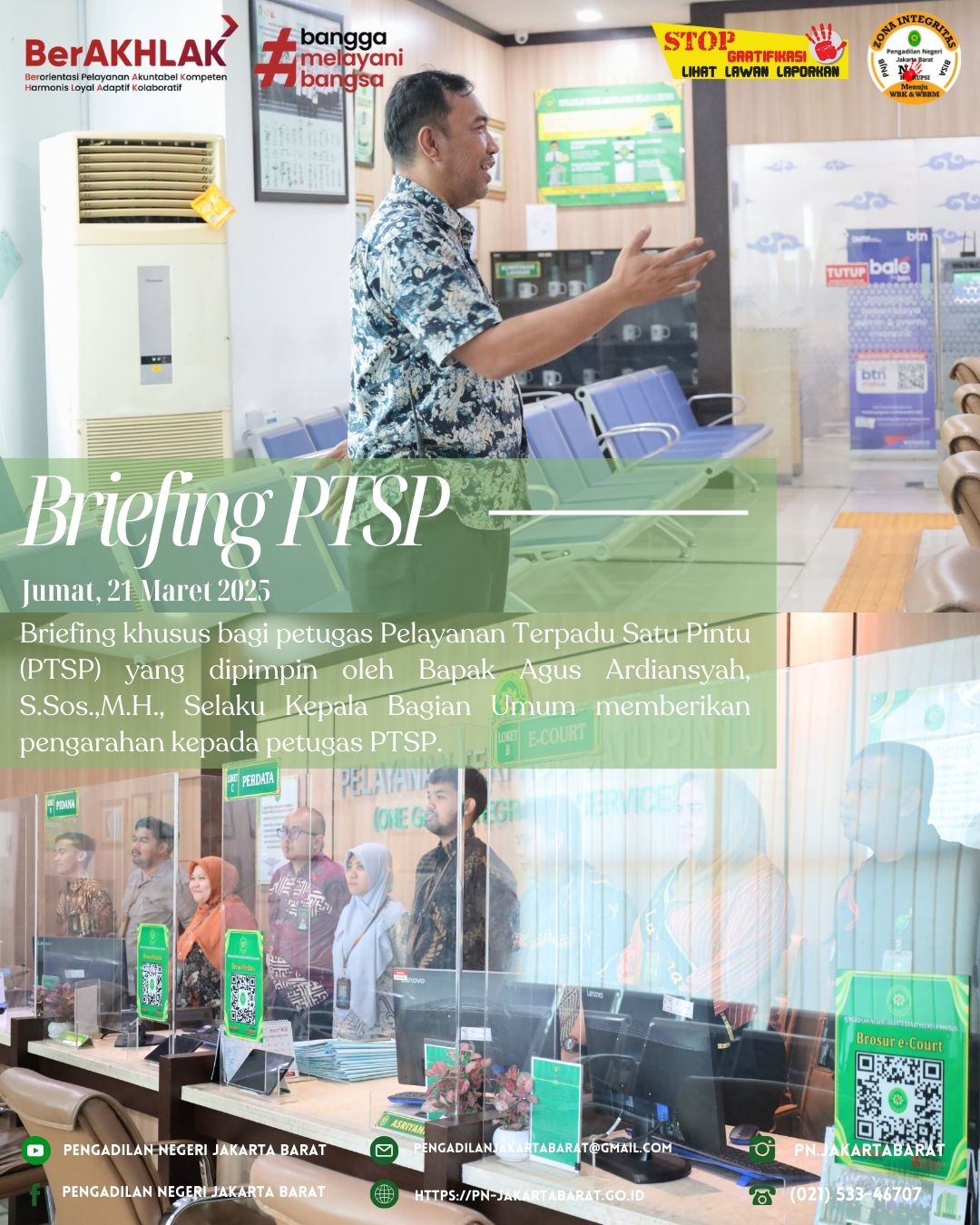 *PNJB, 21 Maret 2025* - Bertempat di lobi PTSP Pengadilan Negeri Jakarta Barat, telah diadakan briefing khusus bagi petugas Pelayanan Terpadu Satu Pintu (PTSP) yang dipimpin oleh Bapak Agus Ardiansyah S.Sos., M.H., selaku Kepala Bagian Umum