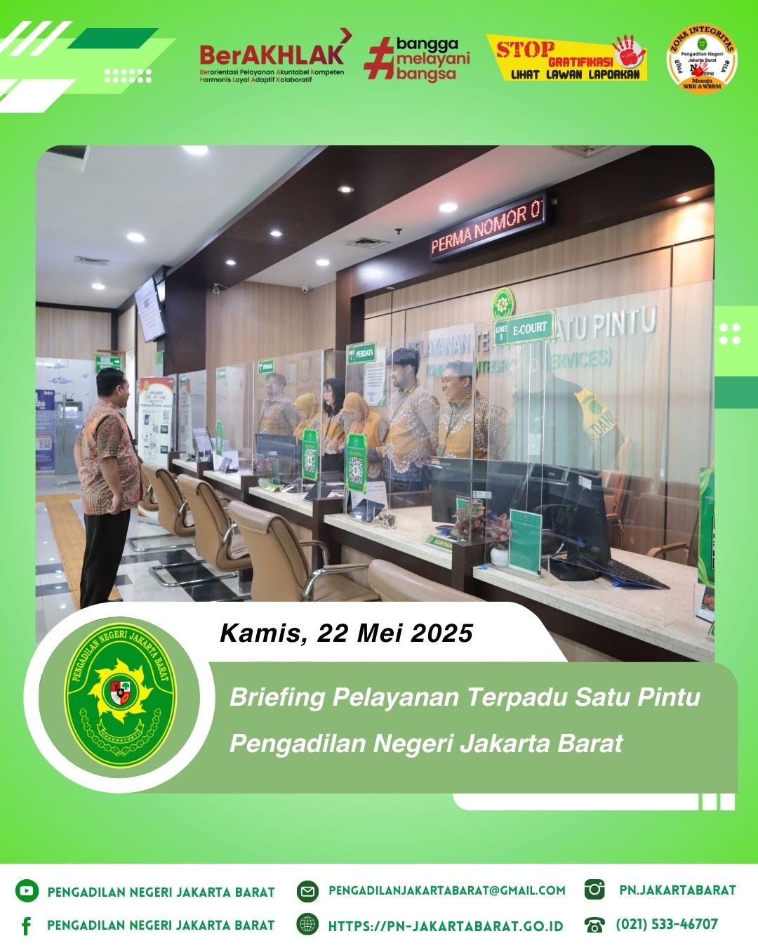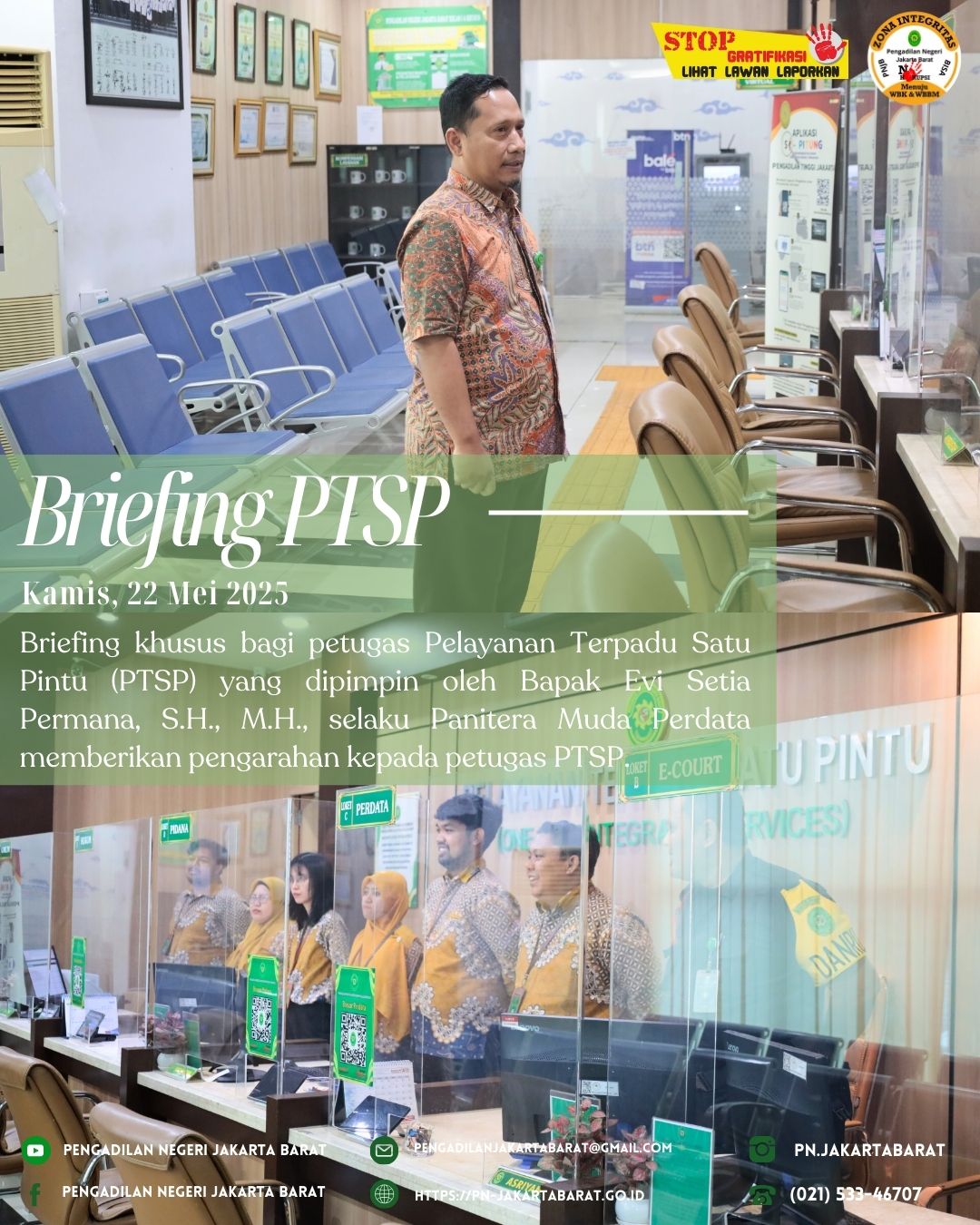 *PNJB, 22 Mei 2025* - Bertempat di lobi PTSP Pengadilan Negeri Jakarta Barat, telah diadakan briefing khusus bagi petugas Pelayanan Terpadu Satu Pintu (PTSP) yang dipimpin oleh Panitera Muda Perdata, Bapak Evi Setia Permana, S.H., M.H.