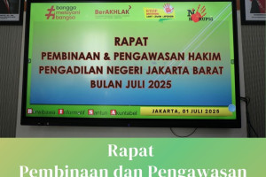 *PNJB, 1 Juli 2025* - Bertempat di Ruang Media Center Lantai 2, Ketua Pengadilan Negeri Jakarta Barat Kelas IA Khusus, Bapak Moehammad Pandji Santoso, S.H., M.H., bersama Wakil Ketua Pengadilan Negeri Jakarta Barat Kelas IA Khusus, Bapak Iwan Anggoro Warsita, S.H., M. Hum., memimpin rapat pembinaan dan pengawasan Hakim bulan Juli 2025…
