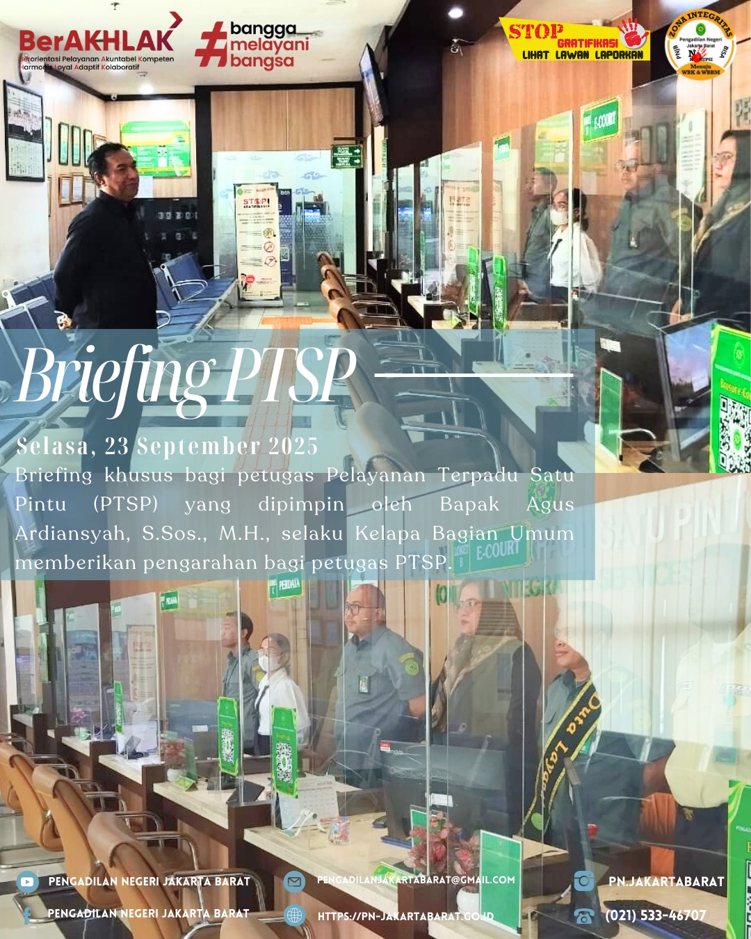 Briefing ini bertujuan untuk lebih meningkatkan kualitas pelayanan kepada masyarakat pencari keadilan di Pengadilan Negeri Jakarta Barat. Dalam kesempatan ini, para petugas PTSP diberikan arahan dan penekanan terhadap pentingnya pelayanan yang sederhana, efisien, transparan, dan akuntabel.