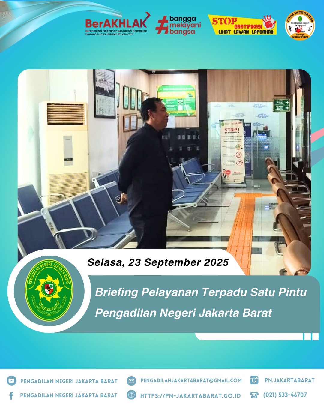 Bertempat di lobi PTSP Pengadilan Negeri Jakarta Barat Kelas IA Khusus, diadakan briefing khusus bagi petugas Pelayanan Terpadu Satu Pintu (PTSP) yang dipimpin oleh Kepala Bagian Umum, Bapak Agus Ardiasnyah, S.Sos., M.H.