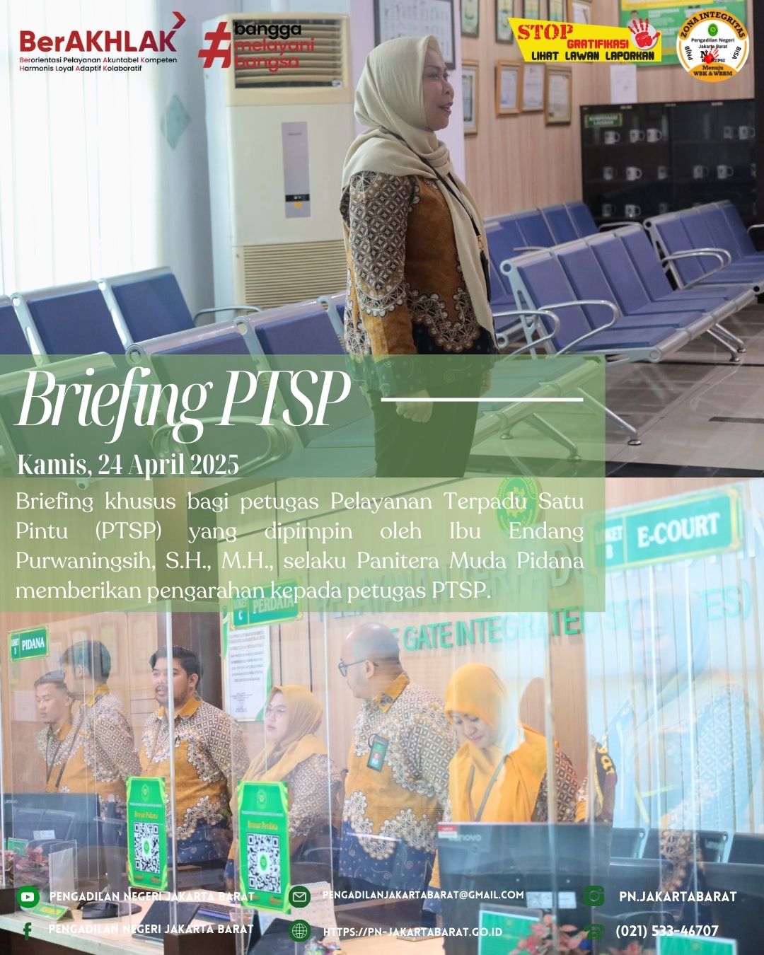 Briefing tersebut bertujuan untuk meningkatkan kualitas pelayanan kepada masyarakat yang membutuhkan layanan di Pengadilan Negeri Jakarta Barat. Dalam kesempatan ini, para petugas PTSP diberikan arahan dan penekanan terhadap pentingnya pelayanan yang efisien, transparan, dan akuntabel.