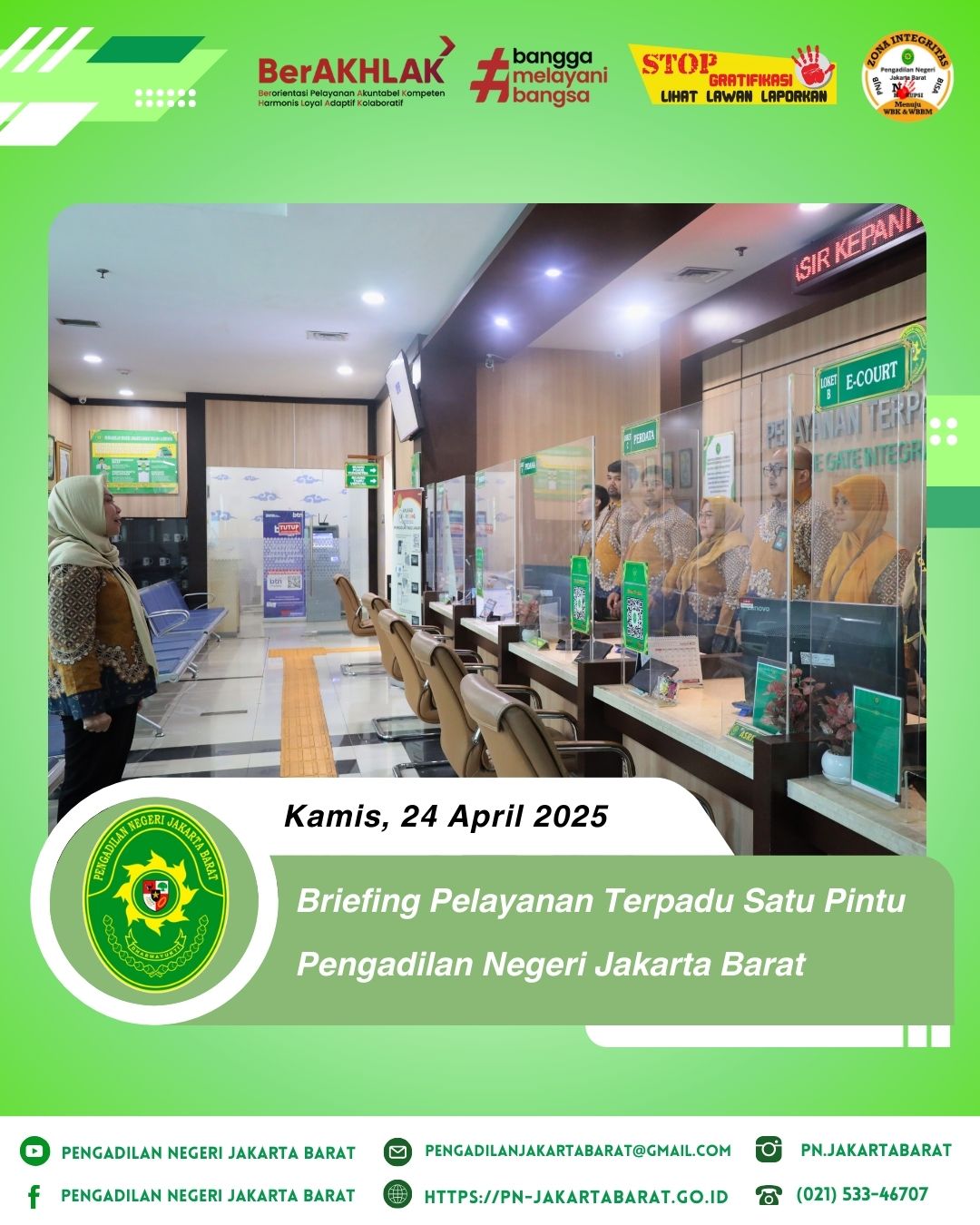 *PNJB, 24 April 2025* - Bertempat di lobi PTSP Pengadilan Negeri Jakarta Barat Kelas IA Khusus, telah diadakan briefing khusus bagi petugas Pelayanan Terpadu Satu Pintu (PTSP) yang dipimpin oleh Panitera Muda Pidana, Ibu Endang Purwaningsih, S.H., M.H.