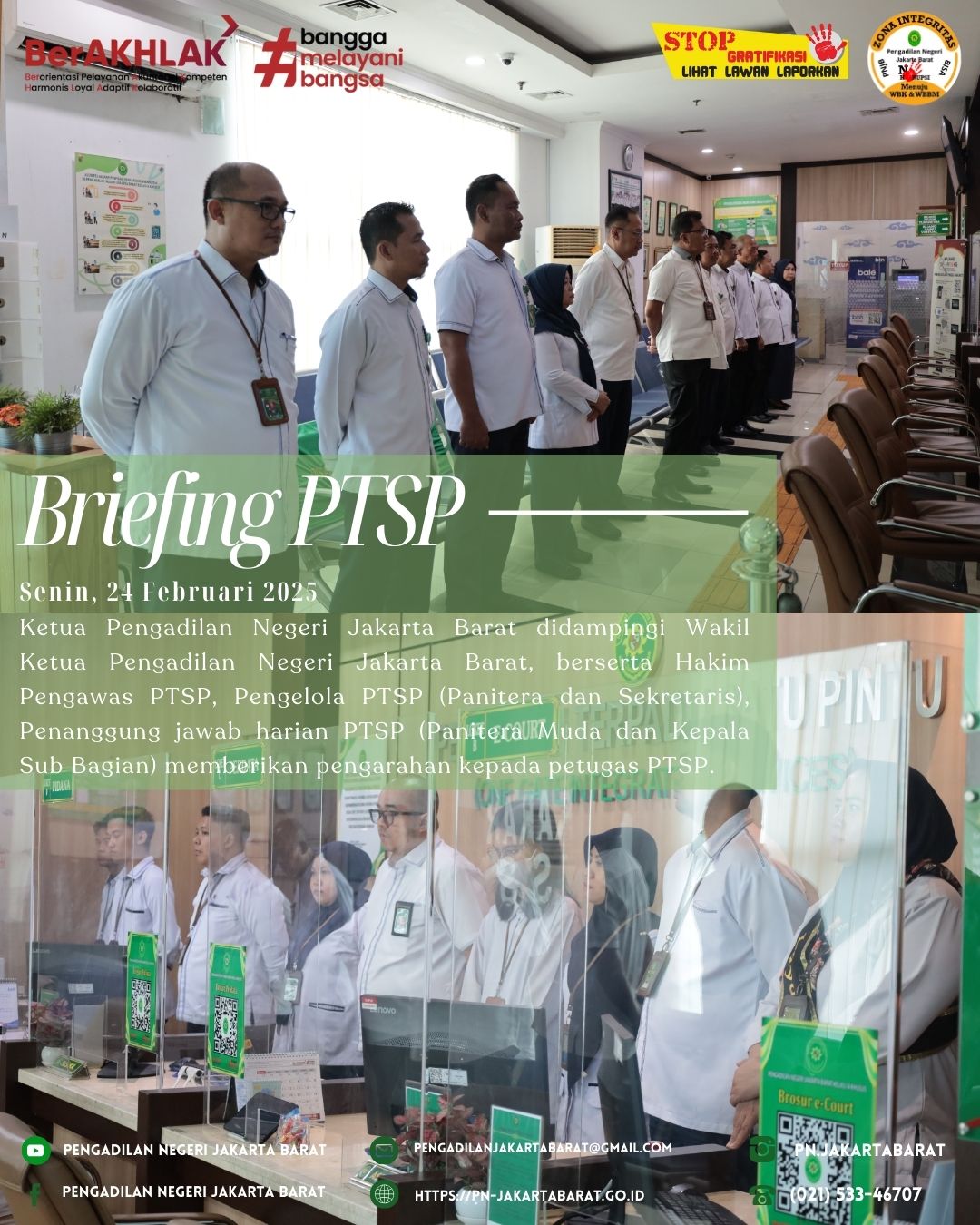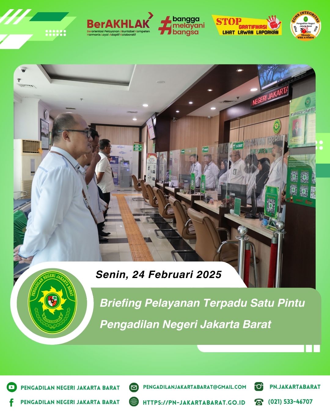 *PNJB, 24 Februari 2025* Briefing Pelayanan Terpadu Satu Pintu (PTSP) yang berlangsung di lobi PTSP Pengadilan Negeri Jakarta Barat dipimpin oleh Ketua Pengadilan Negeri Jakarta Barat, Bapak Dr. Dahlan, S.H., M.H., dan Wakil Ketua Pengadilan Negeri Jakarta Barat, Bapak Achmad Satibi, S.H., M.H., bersama Bapak Demi Hadiantoro, S.H., M.H., selaku Hakim Pengawas PTSP, Panitera dan Sekretaris selaku pengelola PTSP, serta para Panitera Muda dan Kepala Sub Bagian selaku penanggung jawab harian.