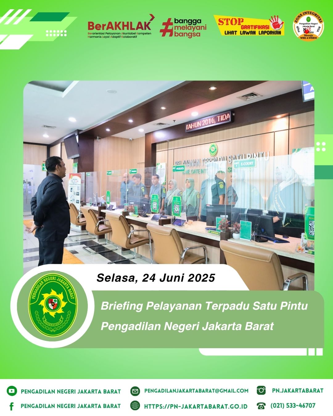 *PNJB, 24 Juni 2025* - Bertempat di lobi PTSP Pengadilan Negeri Jakarta Barat, telah diadakan briefing khusus bagi petugas Pelayanan Terpadu Satu Pintu (PTSP) yang dipimpin oleh Bapak Agus Ardiansyah S.Sos., M.H., selaku Kepala Bagian Umum