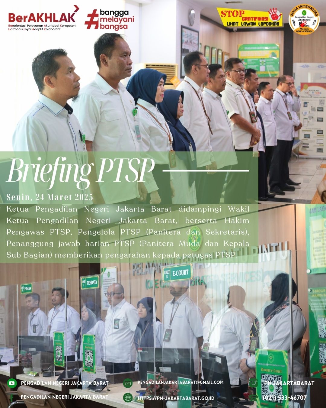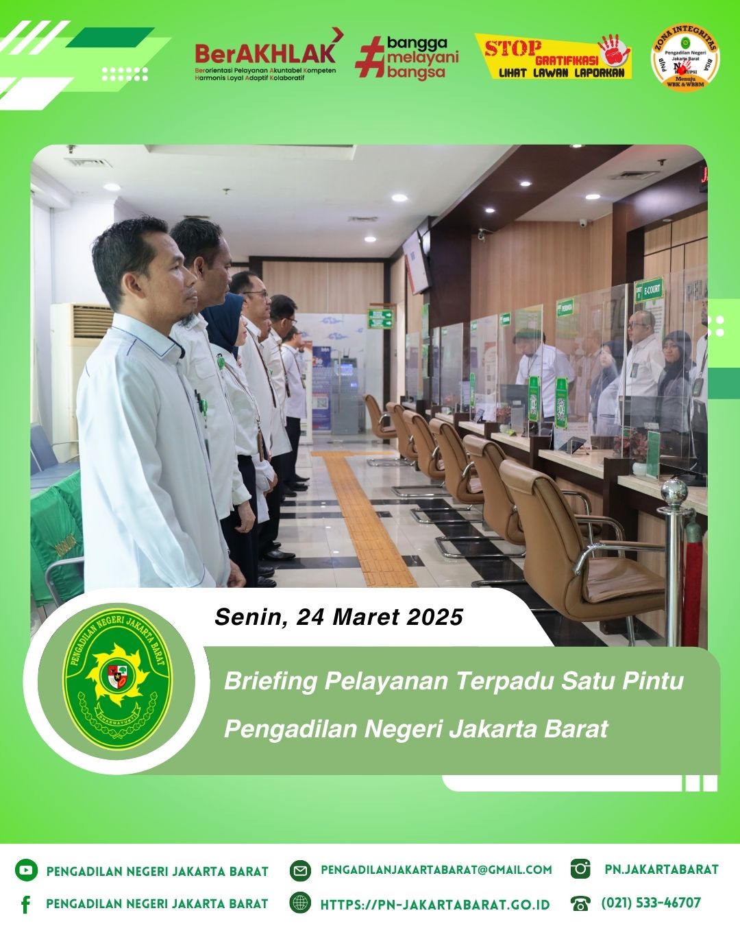 *PNJB, 24 Maret 2025* Briefing Pelayanan Terpadu Satu Pintu (PTSP) yang berlangsung di lobi PTSP Pengadilan Negeri Jakarta Barat dipimpin oleh Ketua Pengadilan Negeri Jakarta Barat, Bapak Dr. Dahlan, S.H., M.H., dan Wakil Ketua Pengadilan Negeri Jakarta Barat, Bapak Achmad Satibi, S.H., M.H., bersama Bapak Demi Hadiantoro, S.H., M.H., dan Ibu Febri Purnamavita, S.H., M.H., selaku Hakim Pengawas PTSP, Panitera dan Sekretaris selaku pengelola PTSP, serta para Panitera Muda dan Kepala Sub Bagian selaku penanggung jawab harian.