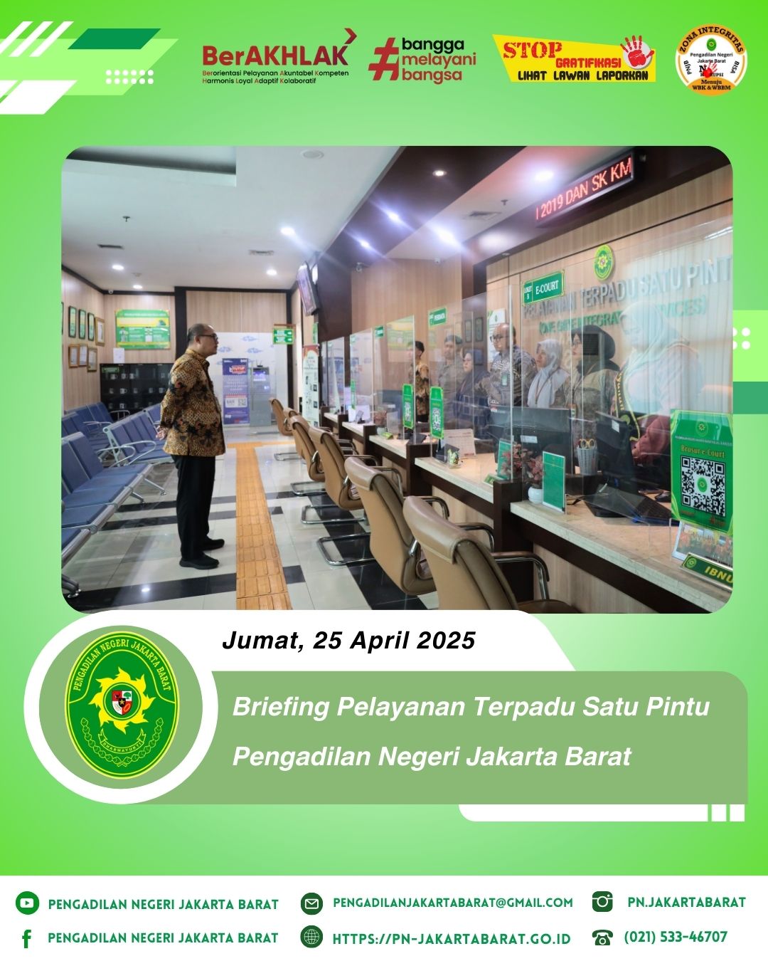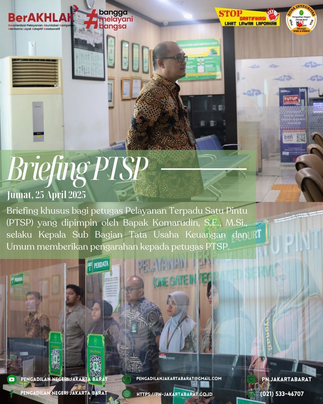 *PNJB, 25 April 2025* - Bertempat di lobi PTSP Pengadilan Negeri Jakarta Barat Kelas IA Khusus, telah diadakan briefing khusus bagi petugas Pelayanan Terpadu Satu Pintu (PTSP) yang dipimpin oleh Bapak Komarudin, S.E., M.Si., selaku Kepala Sub Bagian Tata Usaha Keuangan dan Umum.