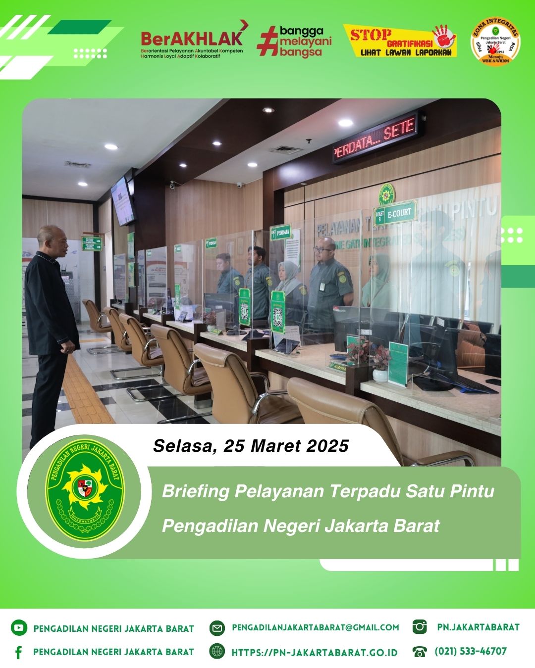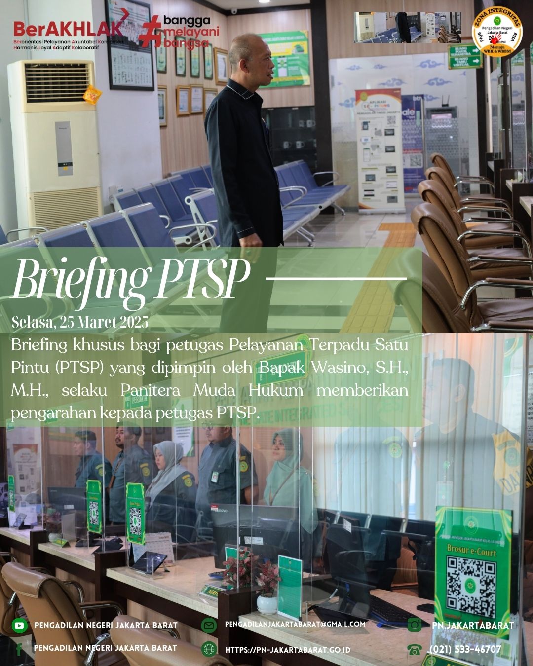 *PNJB, 25 Maret 2025* - Bertempat di lobi PTSP Pengadilan Negeri Jakarta Barat, telah diadakan briefing khusus bagi petugas Pelayanan Terpadu Satu Pintu (PTSP) yang dipimpin oleh Panitera Muda Hukum, Bapak Wasino, S.H., M.H.