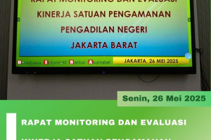 *PNJB, 26 Mei 2025* - Pengadilan Negeri Jakarta Barat melakukan Rapat Monitoring dan Evaluasi Kinerja Satuan Pengamanan Pengadilan Negeri Jakarta Barat yang dipimpin oleh Ketua, Bapak Moehammad Pandji Santoso, S.H., M.H., bersama Sekretaris, Ibu Leliana Sari Harahap, S.H., M.H., Kabag Umum, Bapak Agus Ardiansyah, S.Sos., M.H., Kasubag Tata Usaha dan Keuangan,…