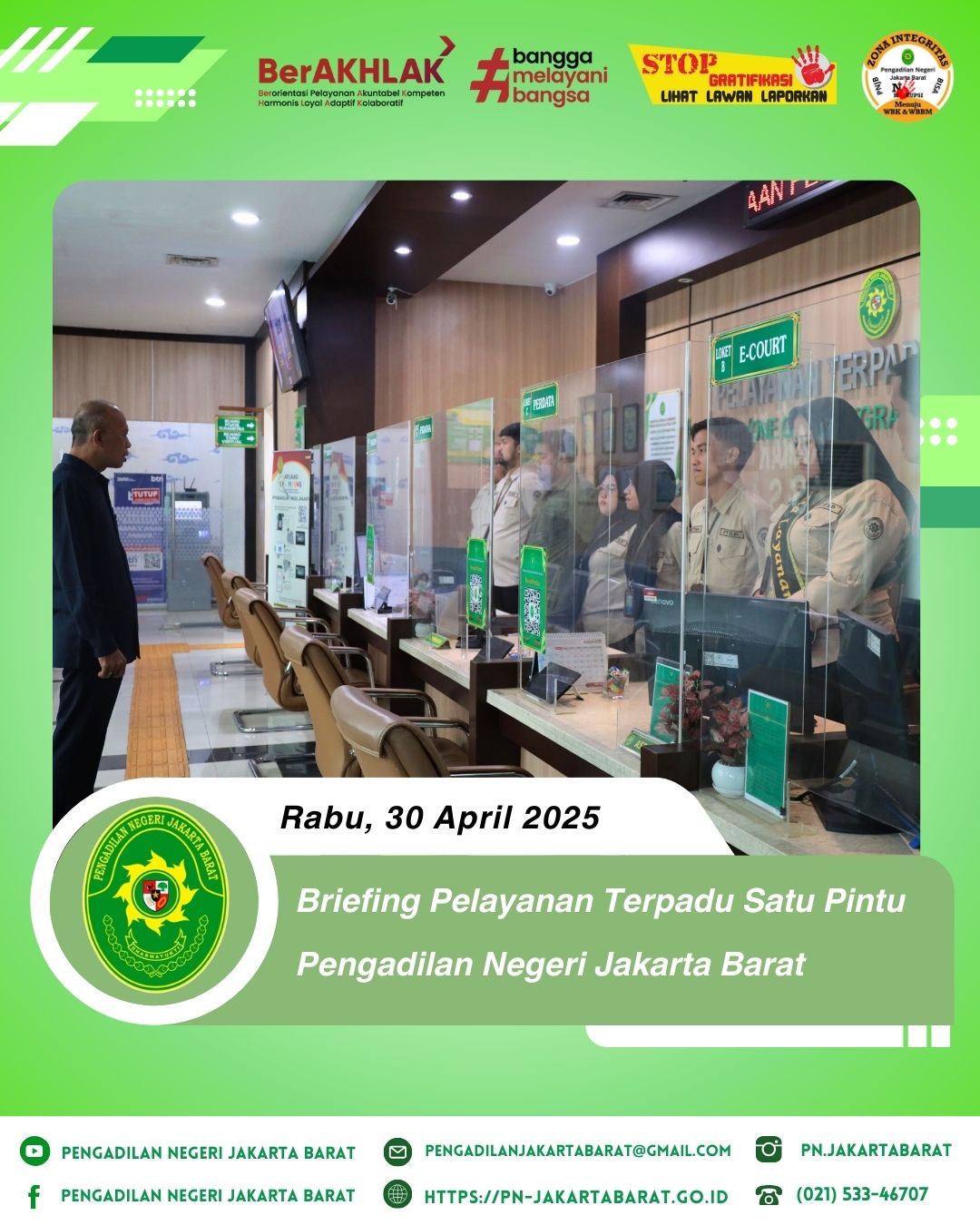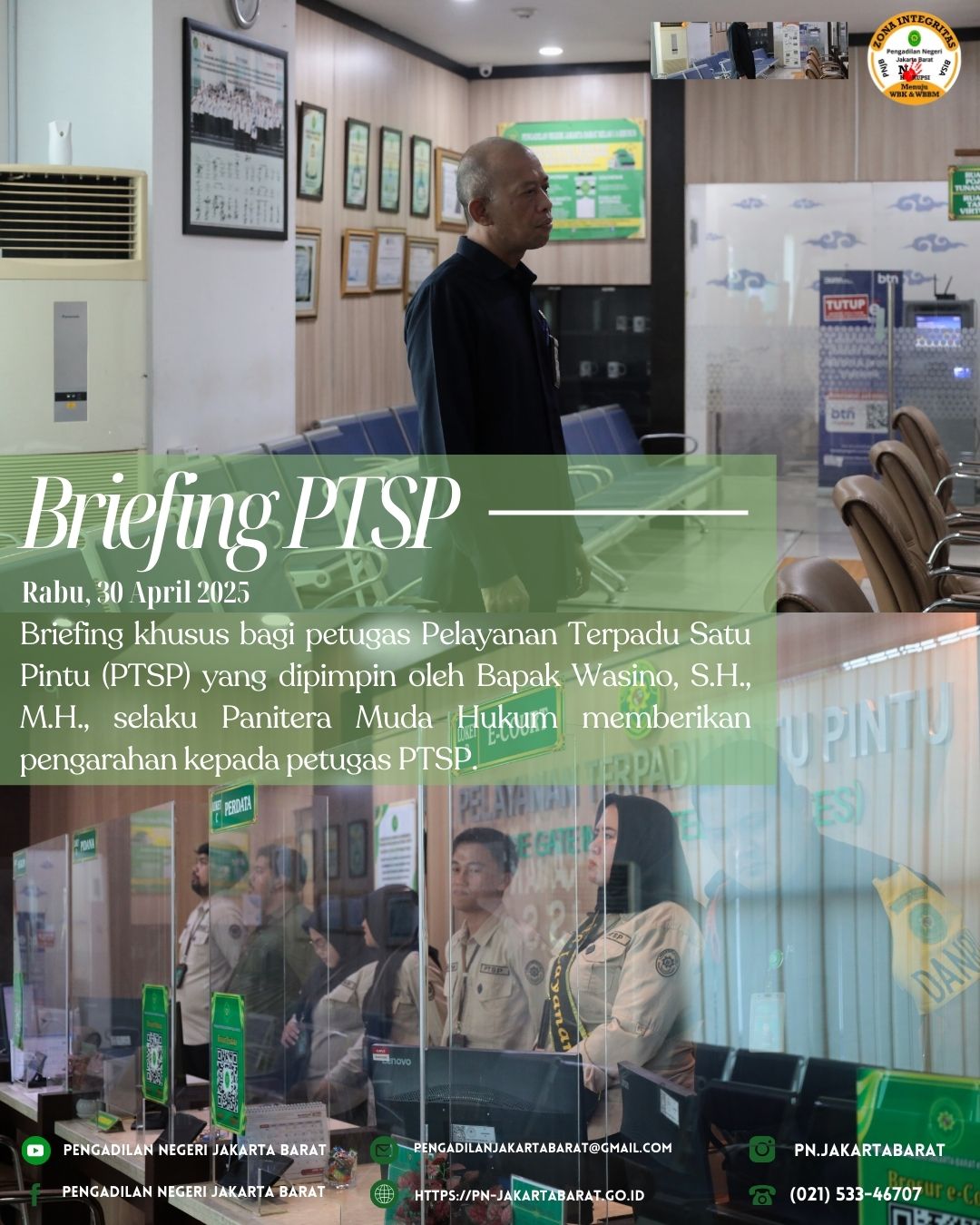 *PNJB, 30 April 2025* - Bertempat di lobi PTSP Pengadilan Negeri Jakarta Barat Kelas IA Khusus, telah diadakan briefing khusus bagi petugas Pelayanan Terpadu Satu Pintu (PTSP) yang dipimpin oleh Panitera Muda Hukum, Bapak Wasino, S.H., M.H.