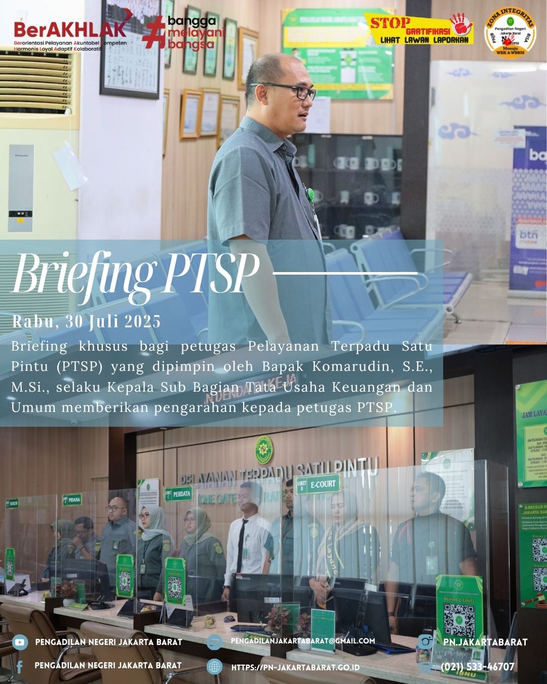 Bertempat di lobi PTSP Pengadilan Negeri Jakarta Barat Kelas IA Khusus, telah diadakan briefing khusus bagi petugas Pelayanan Terpadu Satu Pintu (PTSP) yang dipimpin oleh Bapak Komarudin, S.E., M.Si., selaku Kepala Sub Bagian Tata Usaha Keuangan dan Umum.