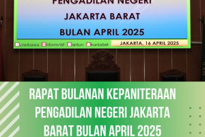 *PNJB, 16 April 2025 * - Panitera Pengadilan Negeri Jakarta Barat, Bapak Iyus Yusuf, S.H., M.H., memimpin acara monitoring dan evaluasi SIPP, MIS dan EIS Bulan April 2025. Dalam monitoring dan evaluasi SIPP, MIS, dan EIS, Bapak Iyus Yusuf, S.H., M.H., selaku Panitera Pengadilan Negeri Jakarta Barat melihat sejauh mana implementasi…