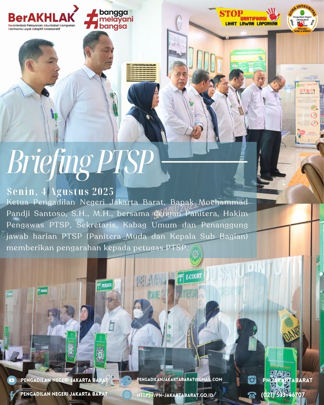 Briefing Pelayanan Terpadu Satu Pintu (PTSP) yang berlangsung di lobi PTSP Pengadilan Negeri Jakarta Barat dipimpin oleh Ketua Pengadilan Negeri Jakarta Barat, Bapak Moehammad Pandji Santoso, S.H., M.H., bersama Bapak Demi Hadiantoro, S.H., M.H. selaku Hakim Pengawas PTSP, Panitera dan Sekretaris selaku pengelola PTSP, dan para Panitera Muda dan Kepala Sub Bagian selaku penanggung jawab harian.