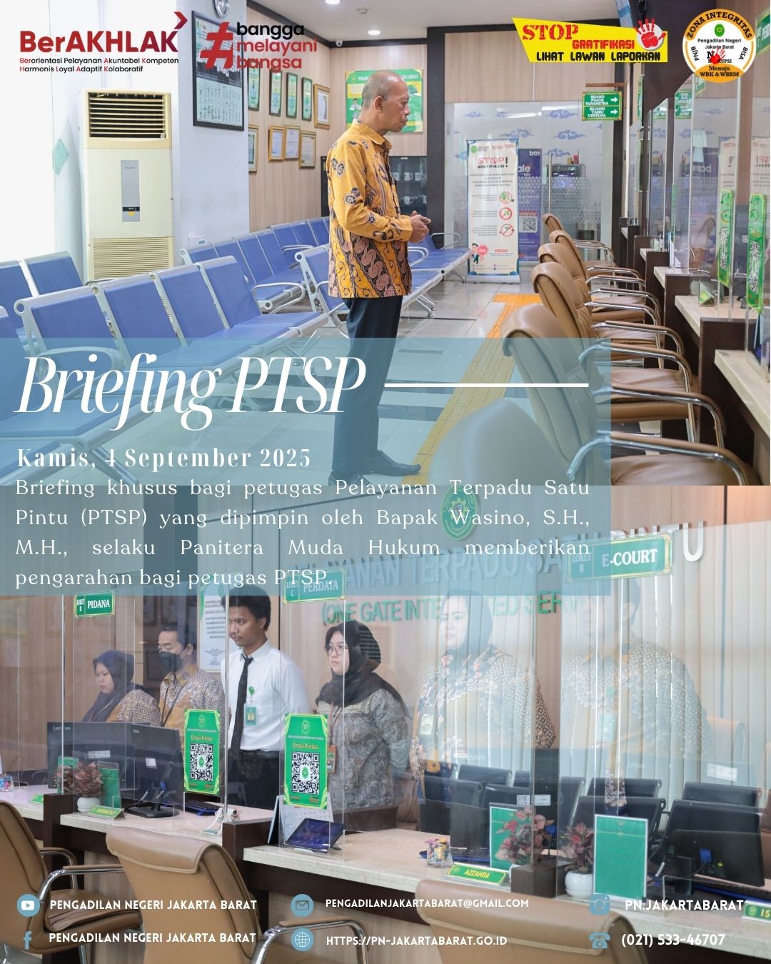 Bertempat di lobi PTSP Pengadilan Negeri Jakarta Barat, telah diadakan briefing khusus bagi petugas Pelayanan Terpadu Satu Pintu (PTSP) yang dipimpin oleh Panitera Muda Hukum, Bapak Wasino, S.H., M.H.