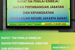 *PNJB, 14 Maret 2025* - Pengadilan Negeri Jakarta Barat Kelas 1A Khusus melaksanakan Rapat Tim Badan Pertimbangan Jabatan dan Kepangkatan yang dipimpin oleh Wakil Ketua Pengadilan Negeri Jakarata Barat, Bapak Achmad Satibi, S.H., M.H., dan didampingi oleh Panitera bersama dengan Hakim Pengawas Ortala, Kabag Umum dan Plt. Kasubag Ortala. Rapat ini…